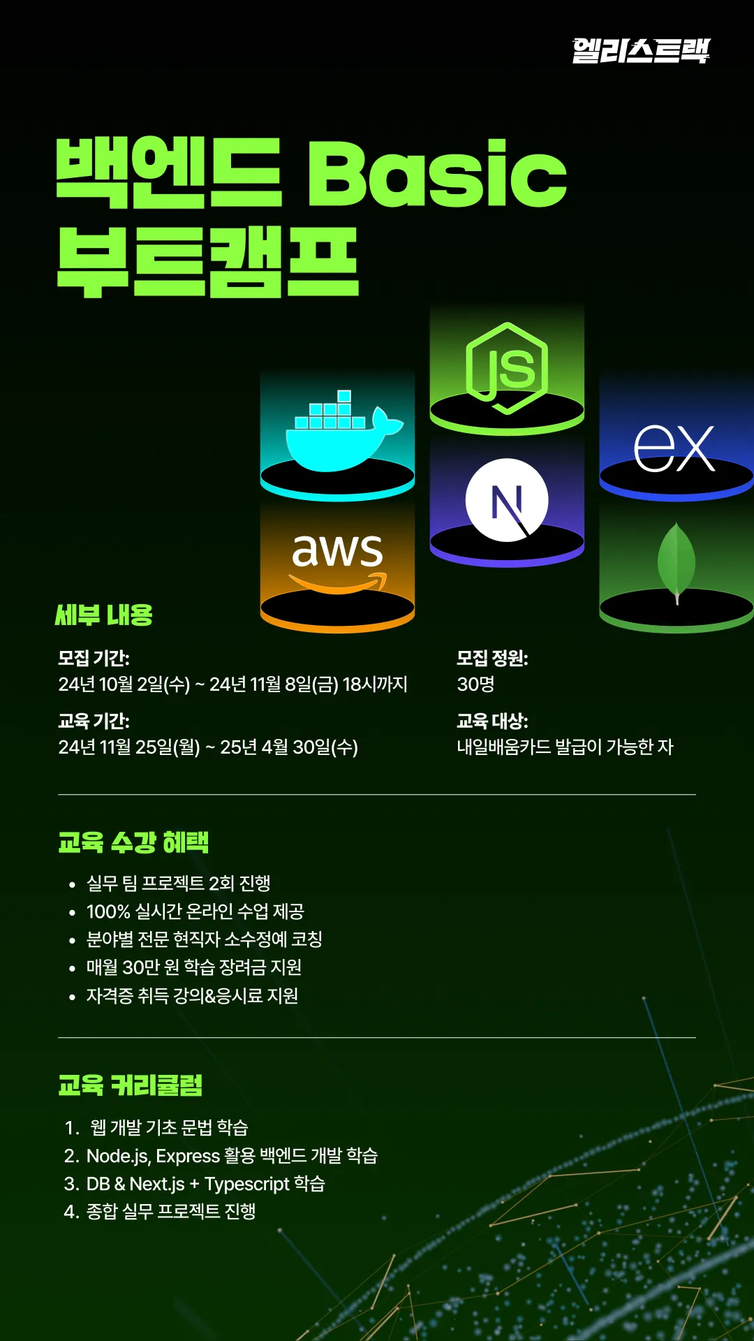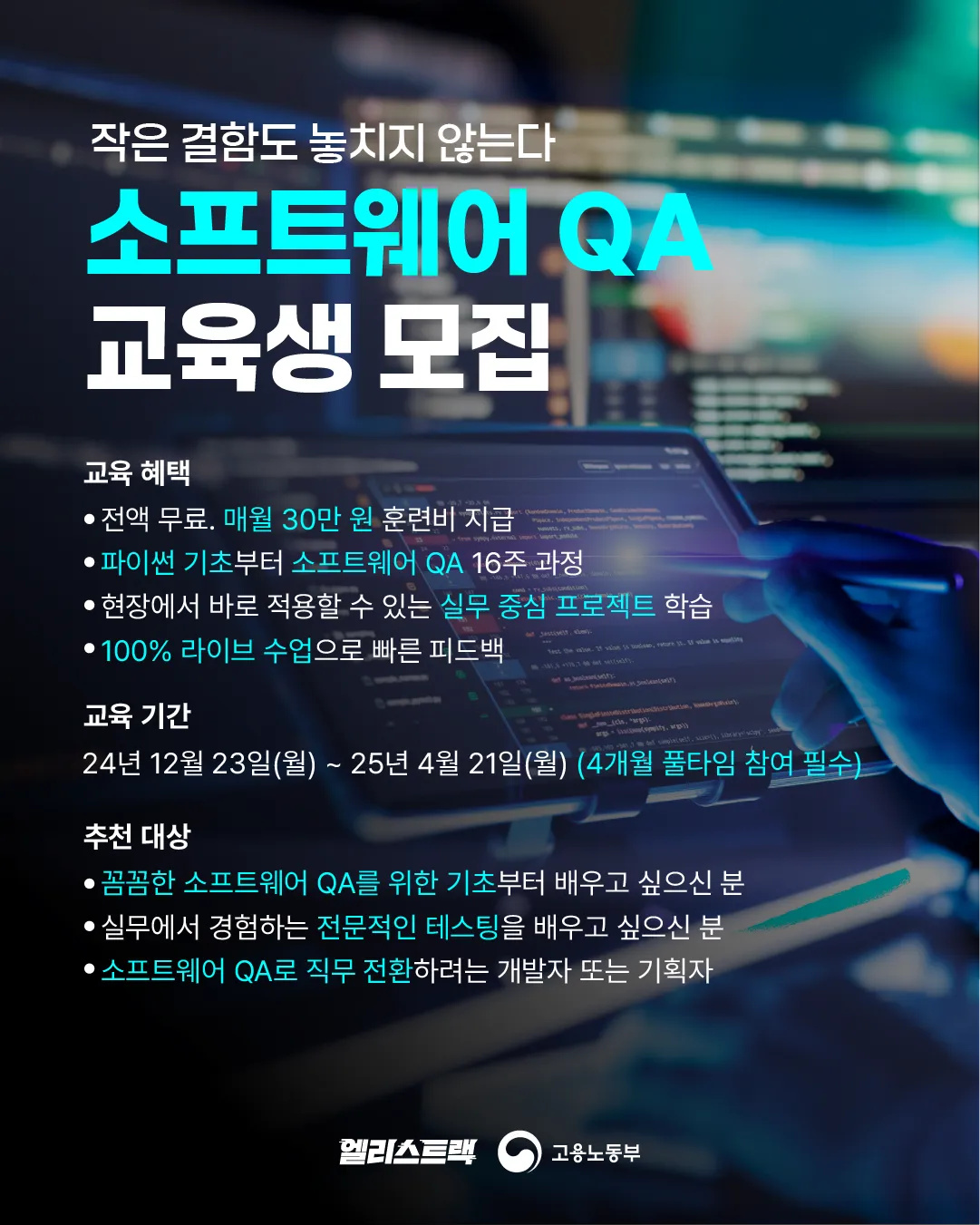 ์ด ๊ฑฑ์ ๋ผ์! ๋น์ผ ๊ต์ก๋น๊ฐ ๋ถ๋ด๋ผ์ ๊ต์ก์ ๋ง์ค์๋ ๋ถ! ์๋ฐ, ํ์ด์ฌ ์ด๋ ต๊ฒ ๋๊ปด์ก๋ค๋ฉด! ๊ฑฑ์ ๋ง์ธ์! AI์ ๊ฐ๋ฐ ๋ถ์ผ ํ์ง ์ ๋ฌธ๊ฐ๋ค์ด A๋ถํฐ Z๊น์ง ๋ฐ์ฐฉ ์ง์ํฉ๋๋ค! ๊ตญ๋ฏผ๋ด์ผ๋ฐฐ์์นด๋๋ก ๊ต์ก๋น ์ ์ก ๋ฌด๋ฃ! (์นด๋๊ฐ ์์ด๋ ์ ์ฒญ๋ฒ๋ถํฐ ๊ผผ๊ผผํ๊ฒ ์๋ด๋๋ ค์!) ๐ ๊ต์ก๊ณผ์ Part 1: ํ์ด์ฌ ๊ธฐ์ด ๋ฐ AI ํ๋ก์ ํธ (์ด๋ก 160์๊ฐ + ์ค์ต 80์๊ฐ) Part 2: ํ๋ก ํธ์๋ + CS ๊ธฐ์ด (์ด๋ก 192์๊ฐ + ์ค์ต 90์๊ฐ) Part 3: JavaScript ๊ธฐ๋ฐ ๋ฐฑ์๋ ์ค๋ฌด (์ด๋ก 296์๊ฐ + ์ค์ต 144์๊ฐ) ๊ต์ก๋น: ์ ์ก ๋ฌด๋ฃ! (๊ตญ๋ฏผ๋ด์ผ๋ฐฐ์์นด๋ ์์ง ์) ๊ต์ก๊ธฐ๊ฐ: 2025๋