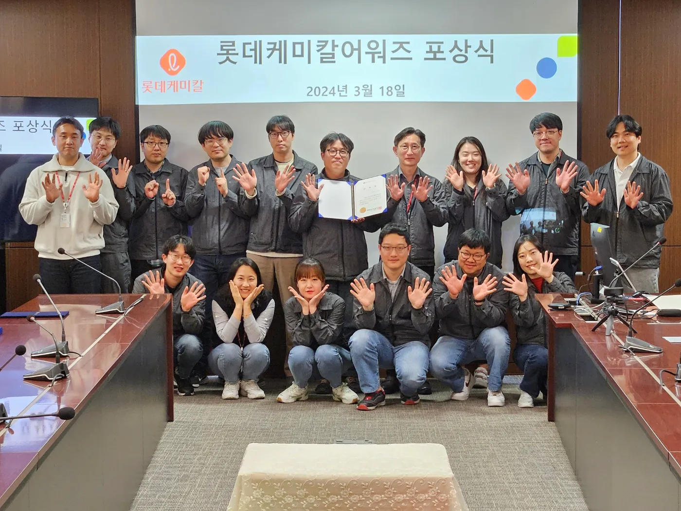 3월 18일에 대회의실에서 롯데케미칼 어워즈를 실시하였습니다. 2023년 회사 이익에 기여하는 업적을 보여준 사람에게 수여되는 Chem People상에는 'Green Promise 2030'을 위한 탄소포집 기술의 업적을 보여준 탄소포집 PJT 남상아 책임이 수상을 하셨습니다. 2023년 한해 동안 본인의 업무에서 멋진 Performance를 보여준 인원에게 수여되는 Best Performanace상은 연구소 사내카페 제작에 힘써준 R&D인사팀 남승두 사원이 수상하였습니다. 회사에 10년이상 희생과 헌신을 보여준 임직원에게 수여되는 CHEM History상은 행정담당 이상화 책임 외 31명이 수상하였습니다. 상 받으신 분들 다시한번 축하드립니다!