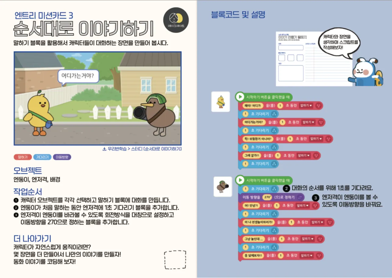 드디어 돌아온 엔트리 코딩수업!! 올해 시작하는 엔트리 코딩 수업은 노벨엔지니어링을 결합한 수업으로 진행합니다. 노벨엔지니어링은 독서와 공학을 융합한 수업방식으로 간단하게 말하면 책을 읽고 책속의 문제상황을 해결해서 해결책을 직접 설계해 보고 이야기를 다시 써보는 과정을 말합니다. 3,4학년은 책을 주제로 5,6학년은 사회적 이슈(환경,인권,환경운동, 인공지능)등의 다양한 주제로 프로젝트 작품을 만들어보는 활동을 할 예정입니다. 이러한 활동을 하기 위해서 4, 5월에는 엔트리 툴을 익히는 기초수업이 진행될 예정입니다. 친구들을 위한 코딩카드를 준비하고 있습니다. 코딩카드를 통해 친구들이 코드를 쉽게 만들고 만들고 싶은 이야기나 장면을 잘 표현할 수 있도록 지도 할 예정입니다. 6월에는 개인 프로젝트를 진행하도록 하겠습니다. ▼ 이전 코딩카드 디자인 ▼ 새로운 코딩카드 디자인 미션코딩카드로 친구들이 코드를 스스로 이해했는지 확인해 볼 수 있도록 확인할 예정입니다. 즐겁고 재미있는 코딩수업을 진행해볼게요 !!