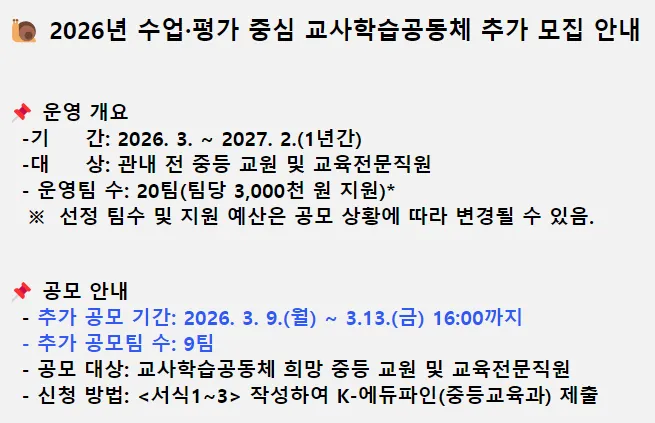 ๊ฐ) -๋ ์: ๊ด๋ด ์ ์ค๋ฑ ๊ต์ ๋ฐ ๊ต์ก์ ๋ฌธ์ง์ - ์ด์ํ ์: 20ํ(ํ๋น 3,000์ฒ ์ ์ง์)* โป ์ ์ ํ์ ๋ฐ ์ง์ ์์ฐ์ ๊ณต๋ชจ ์ํฉ์ ๋ฐ๋ผ ๋ณ๊ฒฝ๋ ์ ์์. ๐ ๊ณต๋ชจ ์๋ด - ์ถ๊ฐ ๊ณต๋ชจ ๊ธฐ๊ฐ: 2026. 3. 9.(์) ~ 3.13.(๊ธ) 16:00๊น์ง - ์ถ๊ฐ ๊ณต๋ชจํ ์: 9ํ - ๊ณต๋ชจ ๋์: ๊ต์ฌํ์ต๊ณต๋์ฒด ํฌ๋ง ์ค๋ฑ ๊ต์ ๋ฐ ๊ต์ก์ ๋ฌธ์ง์ - ์ ์ฒญ ๋ฐฉ๋ฒ: <์์1~3> ์์ฑํ์ฌ K-์๋ํ์ธ(์ค๋ฑ๊ต์ก๊ณผ) ์ ์ถ