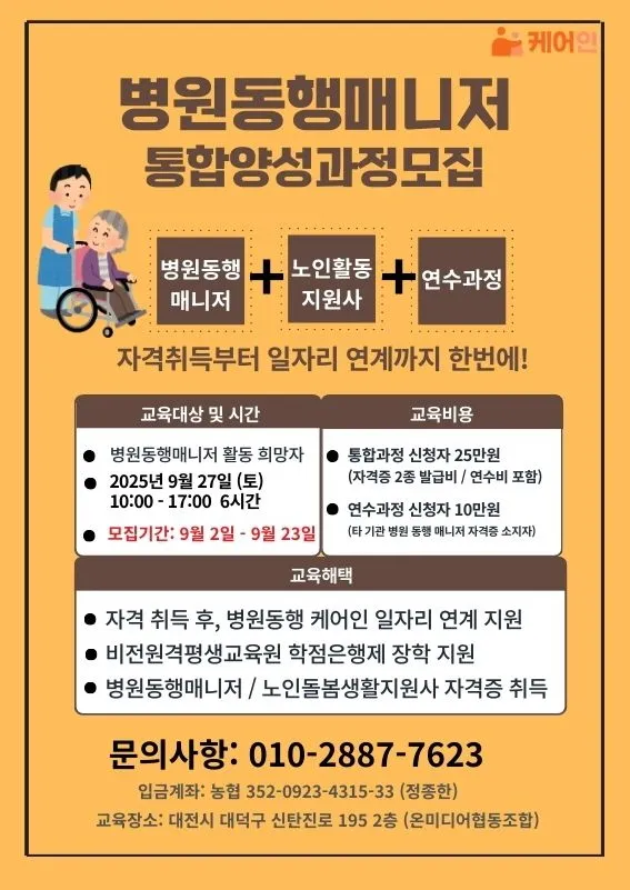 병원동행매니저, 대전지점에서 본격 서비스 시작! 케어인과 온미디어협동조합이 함께하는 돌봄 혁신 고령화 사회로 접어들며 병원 방문이 어려운 노약자, 장애인, 1인 가구 환자들이 증가하고 있습니다. 이에 따라 병원 진료 및 검사에 어려움을 겪는 분들을 위한 맞춤형 서비스가 절실한 시점에, ‘병원동행매니저’ 대전지점이 드디어 본격적인 서비스를 시작합니다. 이번 사업은 온미디어협동조합이 전문 돌봄 기업 ‘케어인’과 협력하여 추진하며, 대전 지역 최초로 병원동행 전문 서비스를 공식화한 것입니다. 병원동행매니저란? ‘병원동행매니저’는 단순한 동행 서비스를 넘어, 병원 진료 전 상담부터 접수, 검사, 처방전 수령, 귀가까지 전 과정에 걸쳐 환자 곁을 지키는 전문 서비스 인력입니다. 또한, 병원 내 간호사나 원무과 직원 등과의 원활한 소통을 통해 환자가 놓치기 쉬운 정보까지 꼼꼼히 전달하는 중간 관리자 역할을 수행합니다. 대전에서 시작되는 새로운 돌봄 문화 이번 대전지점 서비스 시작은 단순한 지역 서비스 확대를 넘어, 지역사회 내 새로운 돌봄 모델을 제시하는 중요한 전환점이 될 것입니다. 온미디어협동조합은 케어인과 협업을 통해 지역민의 건강권 향상과 사회적 돌봄 네트워크 구축을 목표로 하고 있습니다. 이런 분들께 추천합니다 병원 방문이 어려운 고령의 부모님을 혼자 두기 걱정되는 가족 진료 내용이 잘 기억나지 않아 반복 방문하는 독거 어르신 보호자가 없는 장애인 또는 만성질환자 정기검진이나 대학병원 진료에 불안을 느끼는 환자 서비스 문의 및 신청 현재 병원동행매니저 대전지점은 서비스 신청을 받고 있으며, 대전 전 지역을 대상으로 확대 운영할 예정입니다. 자세한 서비스 내용과 신청 방법은 케어인 홈페이지 또는 온미디어협동조합 공식 채널을 통해 확인하실 수 있습니다.
