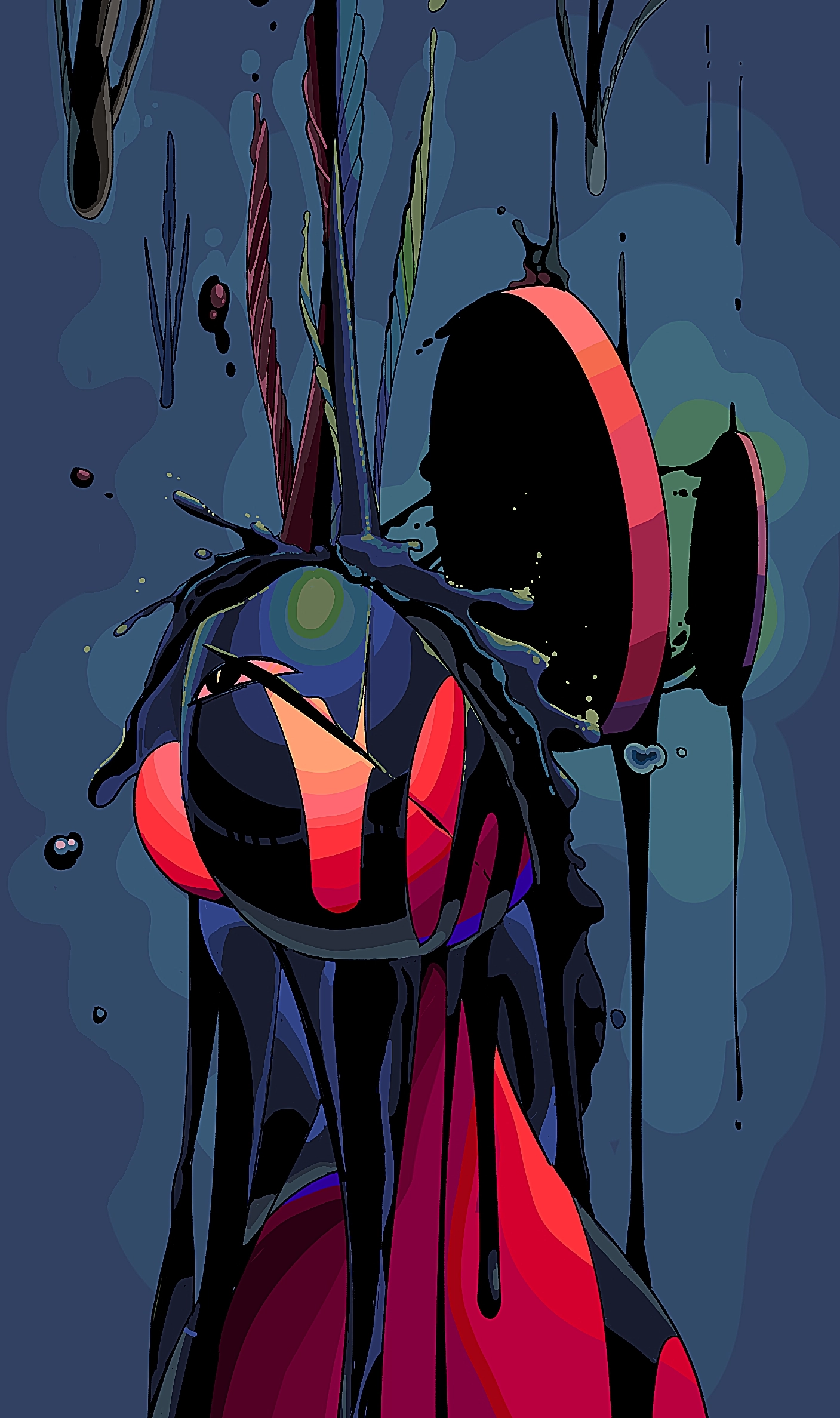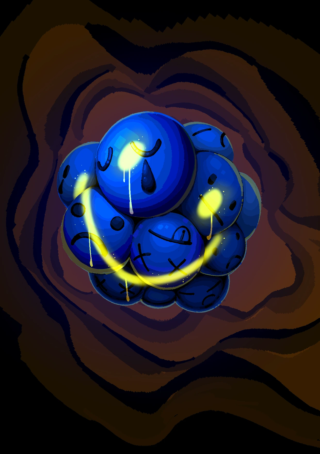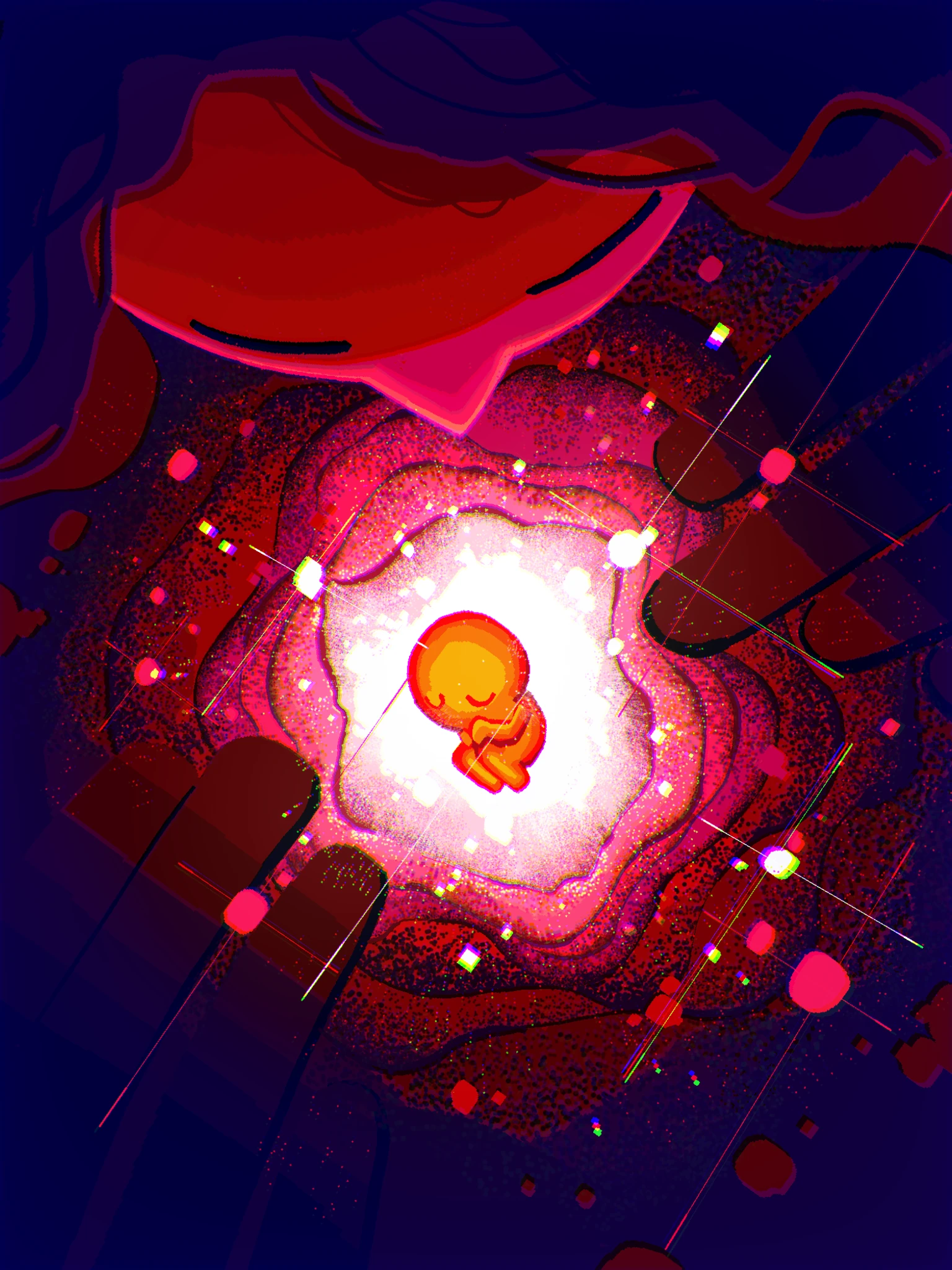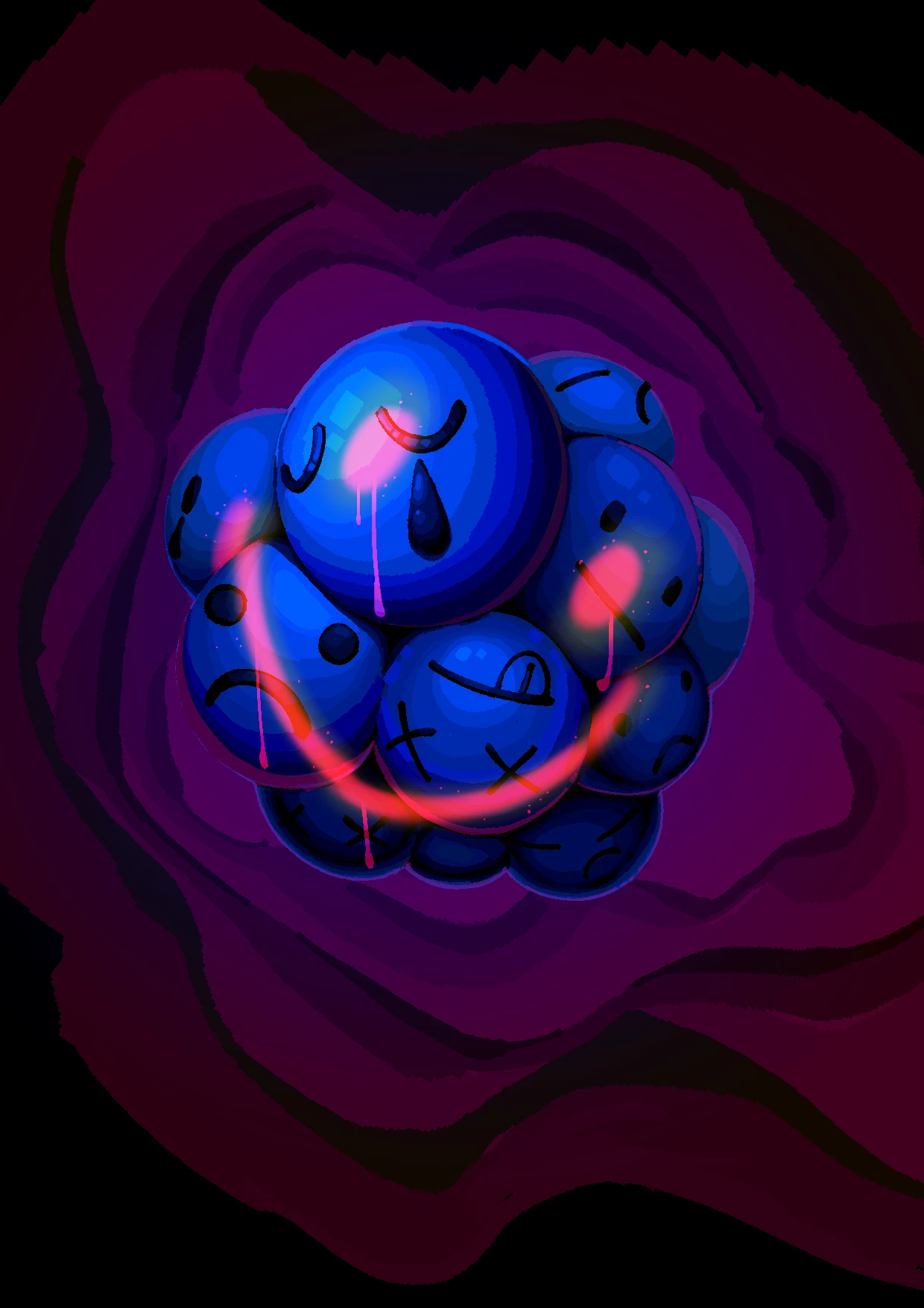 슬픔 끊임없이 자신에 대한 한심함을 늘어놓으며 나타나는 비난과 극단적 사고들, 그리고 이를 느끼며 들어내는 진심인 슬픔을 나타내기 위해, 스스로 도려낸 머리 속으로 내려와 넘치는 슬픔의 눈물이자 피로 자기혐오를 표현했습니다