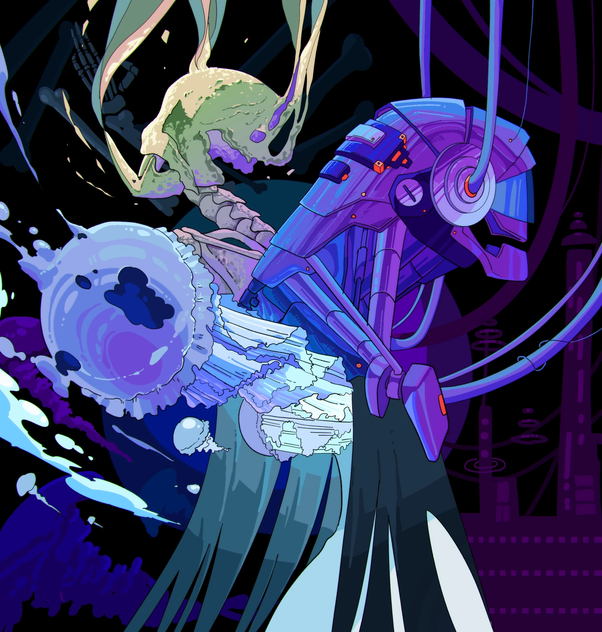 현실도피 스스로의 무력함을 느끼고선 다른 세계의 자신을 상상해보곤합니다. 다른 세계에선 해파리일수도, 고도로 발전한 세계 속 로봇일 수도, 아님 이미 뼈가 되어 천천히 소멸하고 있을 수도 있습니다. 이 모습들이 적어도 현재의 나보단 나을 것이란 차가운 생각을 그림에 담아내었습니다.