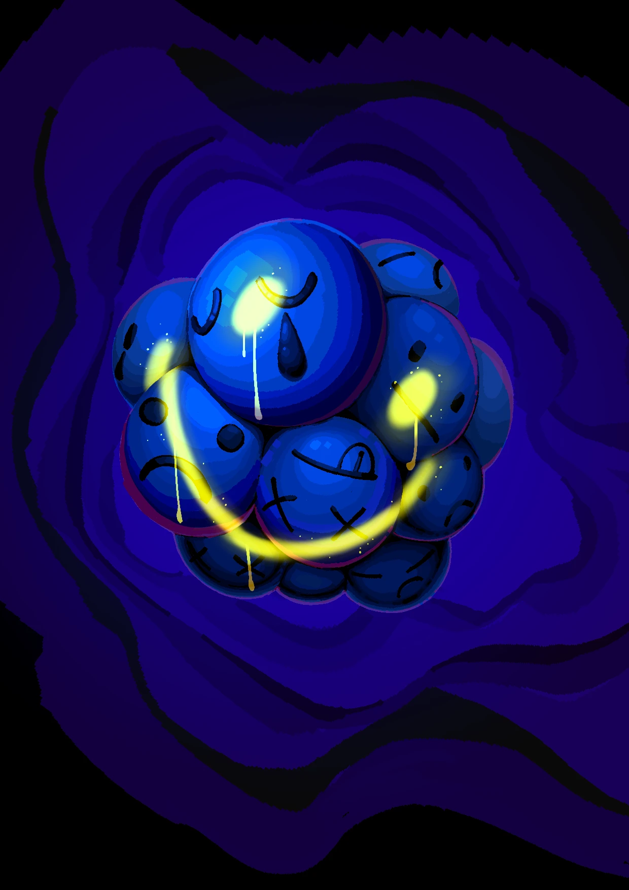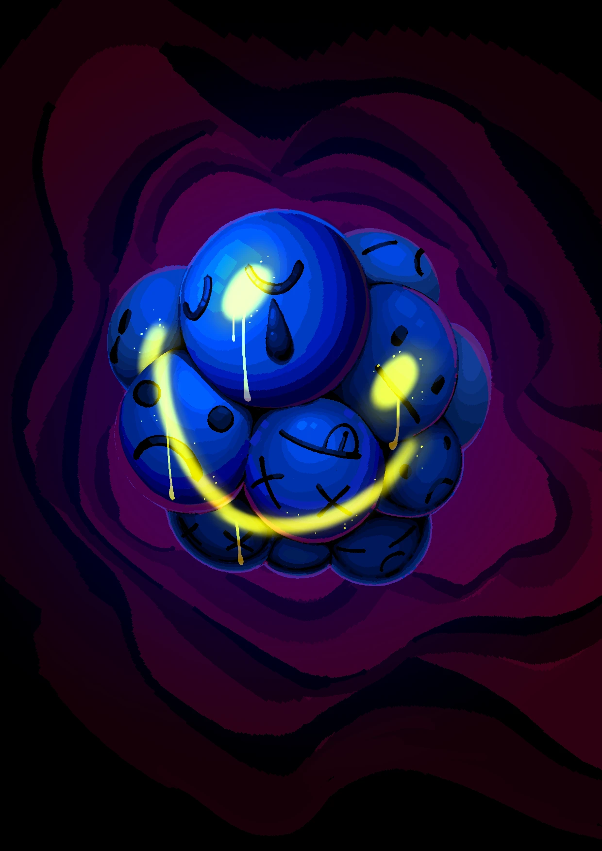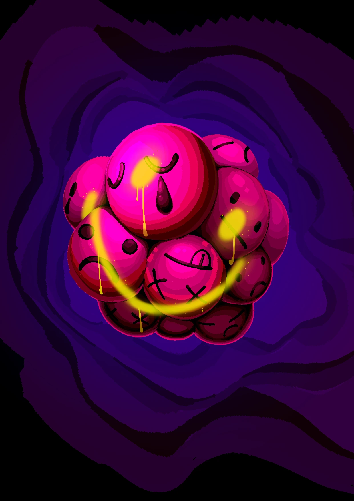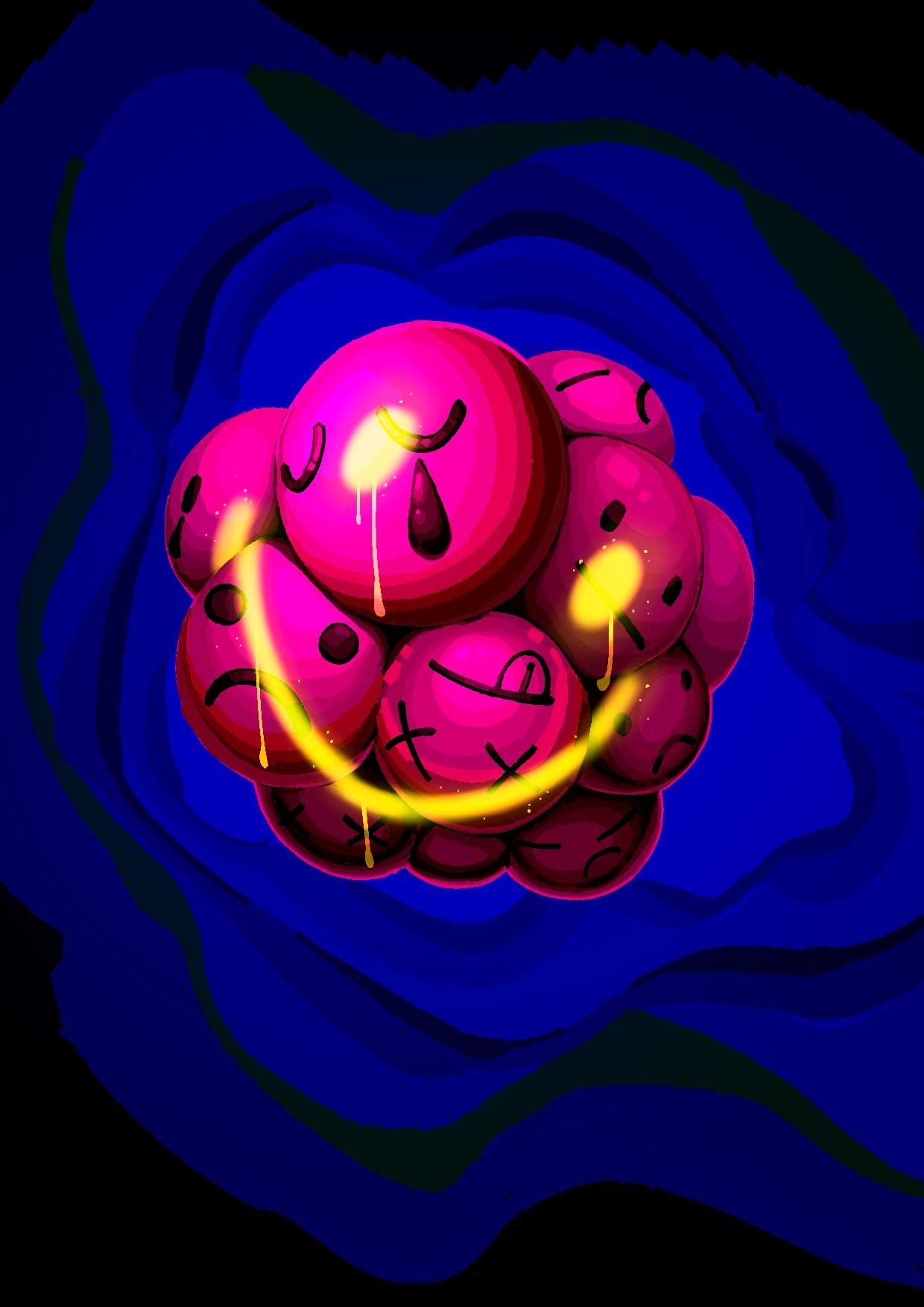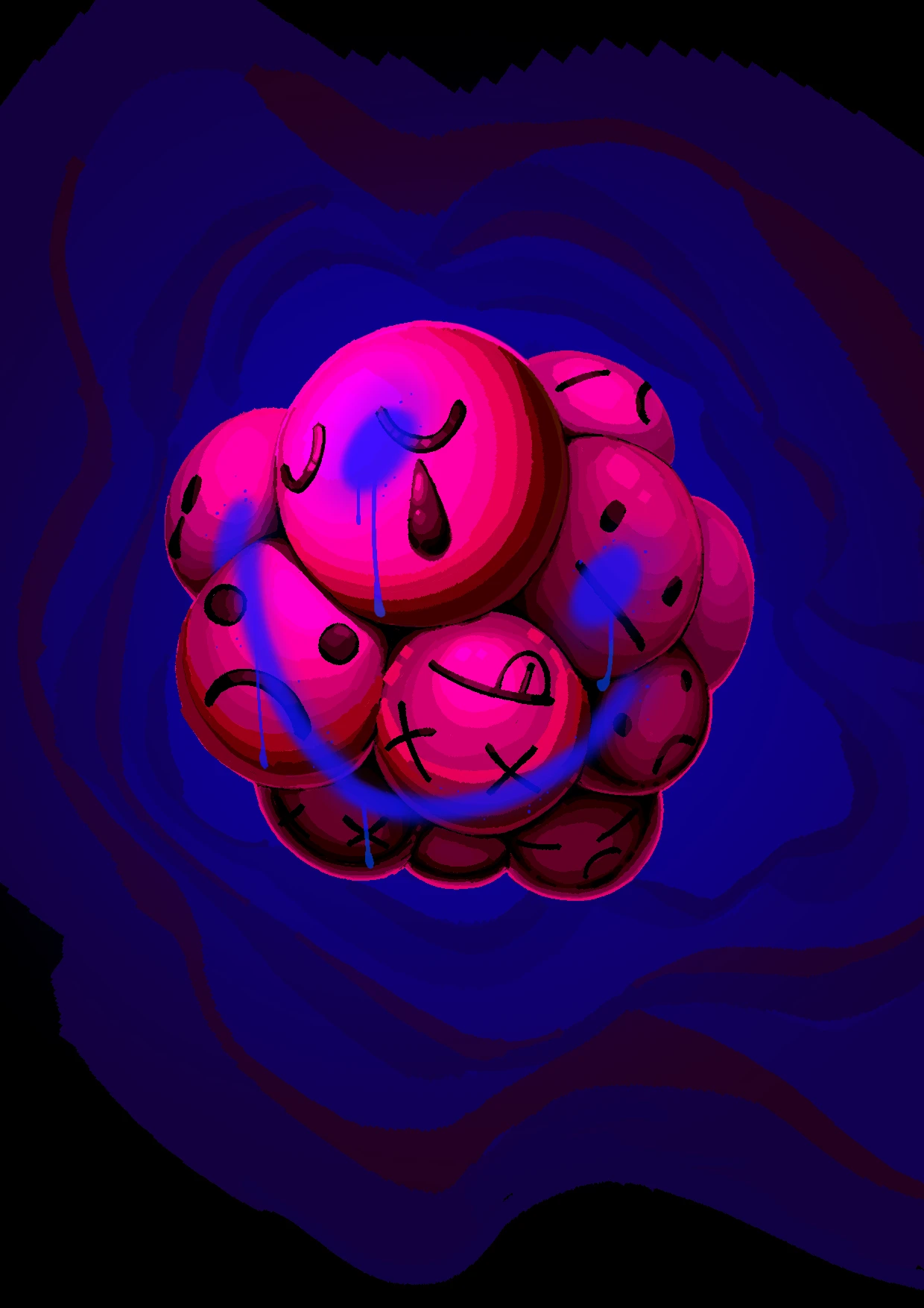 기쁨 기쁨이라는 긍정적 단어가 사회 속에서 어떻게 부정적으로 사용되는지를 생각하며 그려냈습니다. 기쁨이라는 감정 아래에 숨겨야 하는 본연의 슬픔과 분노, 고통을 happy face라 불리는 둥근 이모지를 오마주해 표현하였습니다. 또한 다양한 컬러 버전을 만들어 감정의 색이 하나로 치우지지 않고 다양한 색이 부정적 감정을 비출수 있도록 하였습니다.