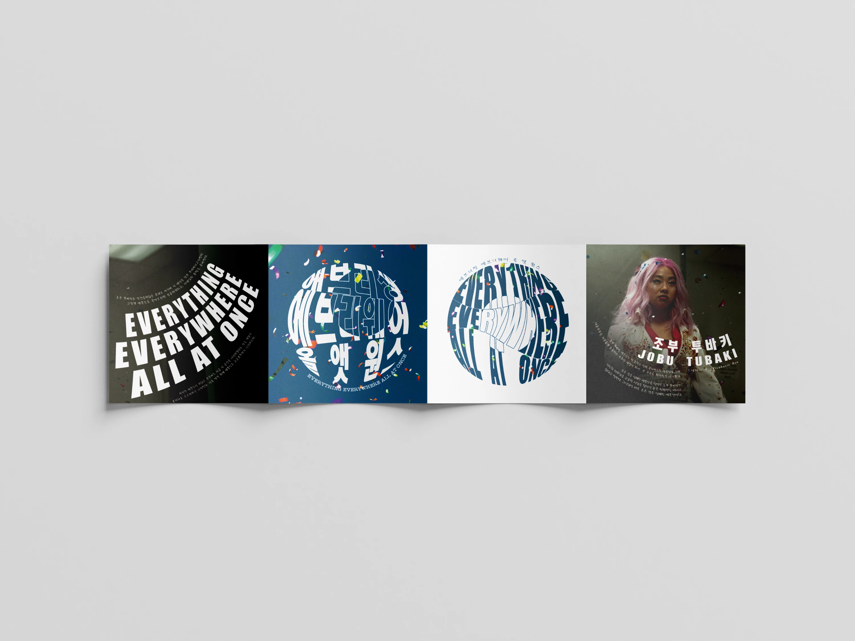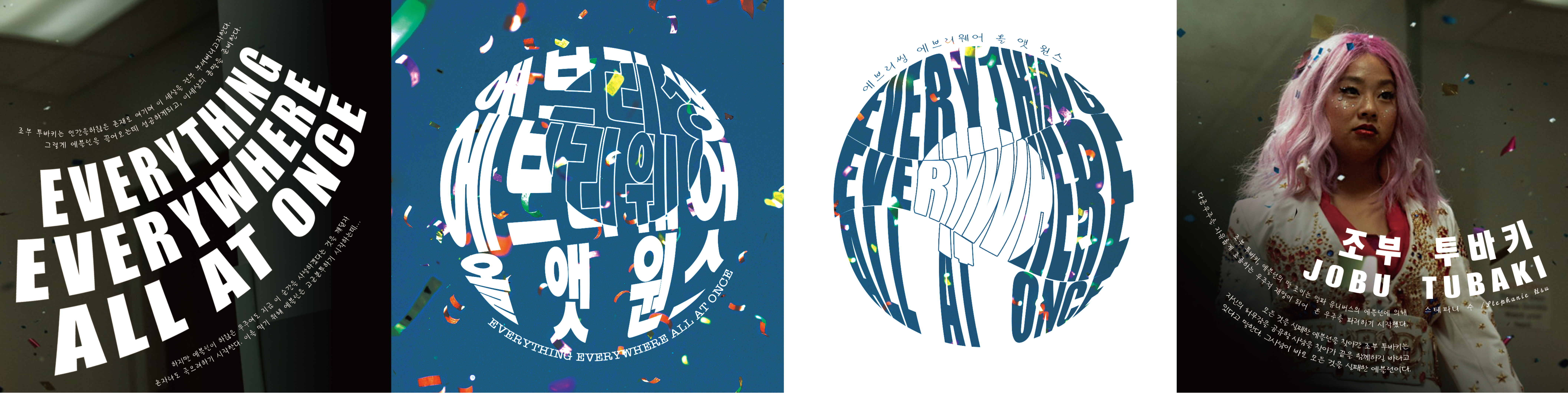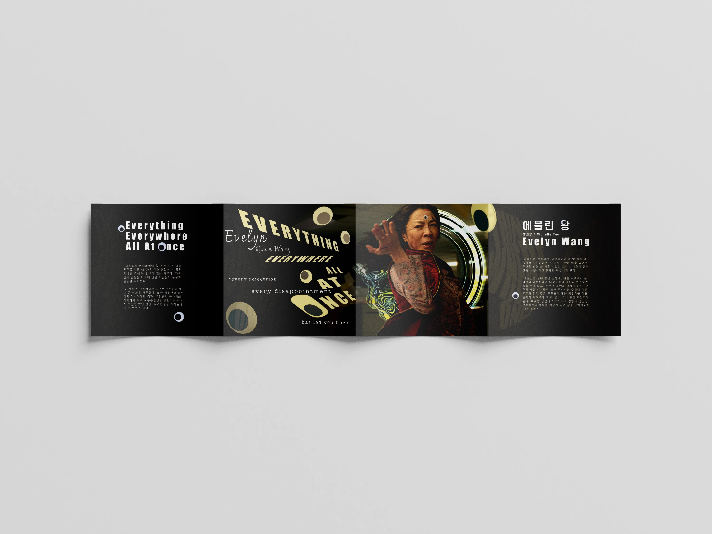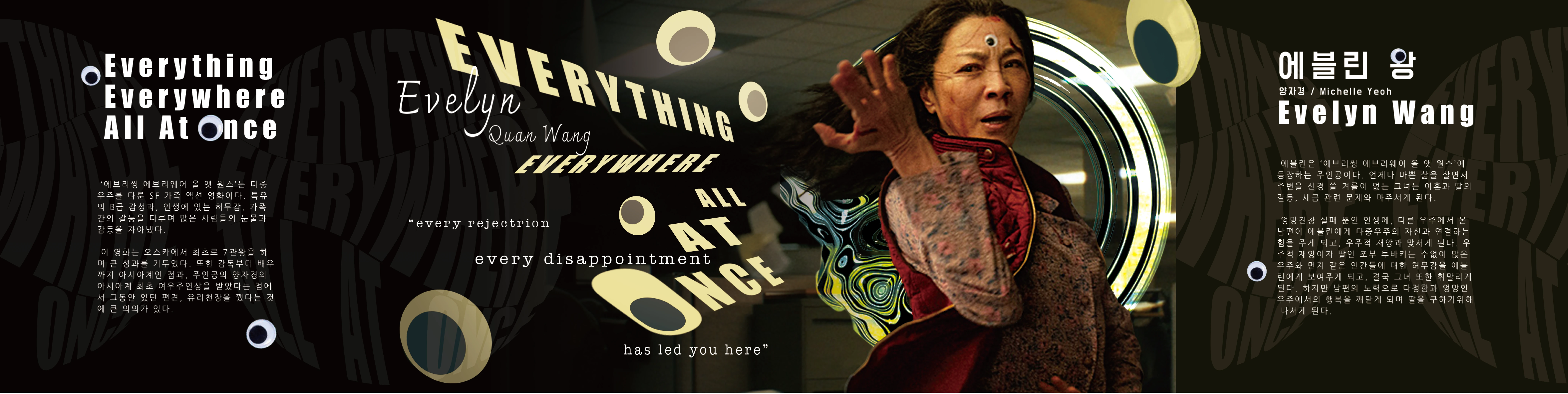 영화 '에브리띵 에브리웨어 올 앳 원스'의 중요한 매게체인 원을 이용한 타이포그래피를 메인으로 표지를 디자인 했습니다. 또한 장난감 눈알이 영화 내내 활용되는 것을 이용해 뒷면 레이아웃 구성에 사용하였습니다.