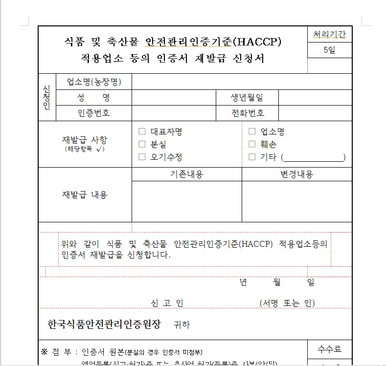 식품 및 축산물 HACCP 적용업소 등의 인증서 재발급 신청.hwp