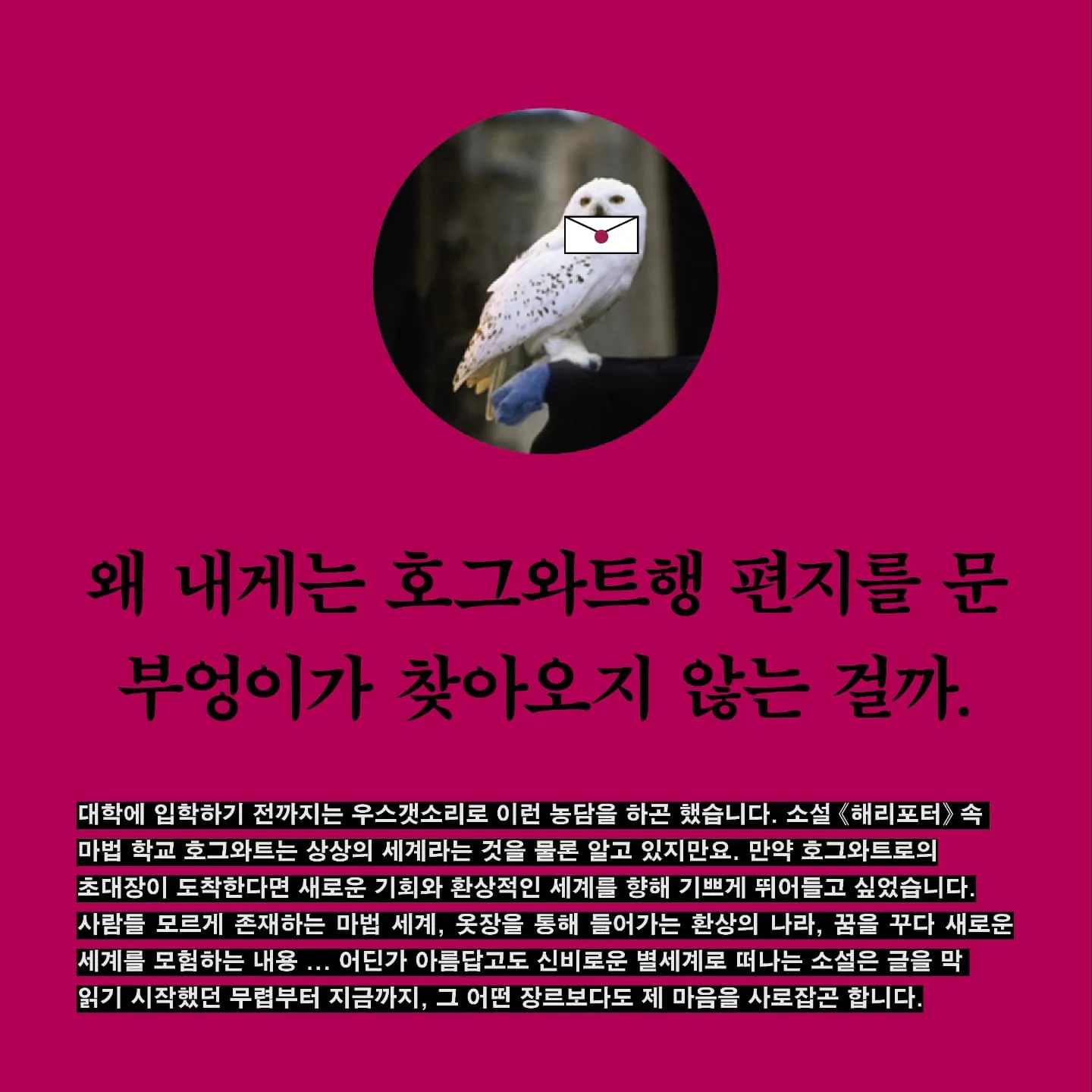 한채영 작업 김소현 디자인 왜 내게는 호그와트행 편지를 문 부엉이가 찾아오지 않는 걸까. 대학에 입학하기 전까지는 우스갯소리로 이런 농담을 하곤 했습니다. 소설 《해리포터》속 마법 학교 호그와트는 상상의 세계라는 것을 물론 알고 있지만요. 만약 호그와트로의 초대장이 도착한다면 새로운 기회와 환상적인 세계를 향해 기쁘게 뛰어들고 싶었습니다. 사람들 모르게 존재하는 마법 세계, 옷장을 통해 들어가는 환상의 나라, 꿈을 꾸다 새로운 세계를 모험하는 내용... 어딘가 아름답고도 신비로운 별세계로 떠나는 소설은 글을 막 읽기 시작했던 무렵부터 지금까지, 그 어떤 장르보다도 제 마음을 사로잡곤 합니다. 이상 세계에 대한 막연한 동경. 어렸을 적에는 순수한 모험심이나 설렘 때문이었다면, 지금에 와서는 진로와, 직업과, 보다 현실적인 고민들이 묻어 보다 복잡한 감정이 되었습니다. 그곳에서 완전한 나를 찾을 수 있을 거라는 기대감이나, 돈... 명예... 세속적인 가치들을 버릴 만큼 완전한 충족감을 주는 일을 찾을 수 있을 것이라는 막연한 상상... 그렇다면 유토피아에 대한 동경은 어쩌면 현실에 대한 회피일까요? 그렇지만 세상은 여전히 아름다운 구석이 참 많이 존재하고, 시선을 사로잡고 감탄을 자아내는 것들이나, 별 이유 없이 단지 마음이 끌린다는 이유만으로 애정을 줄 것들로 충만합니다. 한때는 환상을 가졌었던, 그러나 지금은 완전한 일상이 되어버린 서울에서 만난 일상의 순간들과 유토피아로의 '입구'를 합치는 작업은 여기서 시작했습니다. 언젠가 환상세계로 향하는 문이 열렸을 때, 떠나기를 망설일 수 있도록 제가 사랑하는 것들이 점점 늘어나기를 바라는 소망과, 새로운 세계로 발걸음을 떼더라도 그 모든 이유가 순수한 '모험심'과 '즐거움'이기를 바라는 마음에서 말입니다.