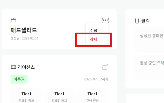 1) 워크스페이스 설정 탭에서 우측 상단 메뉴 아이콘을 클릭하면 메뉴가 펼쳐집니다. 메뉴에서 '삭제'를 클릭합니다.