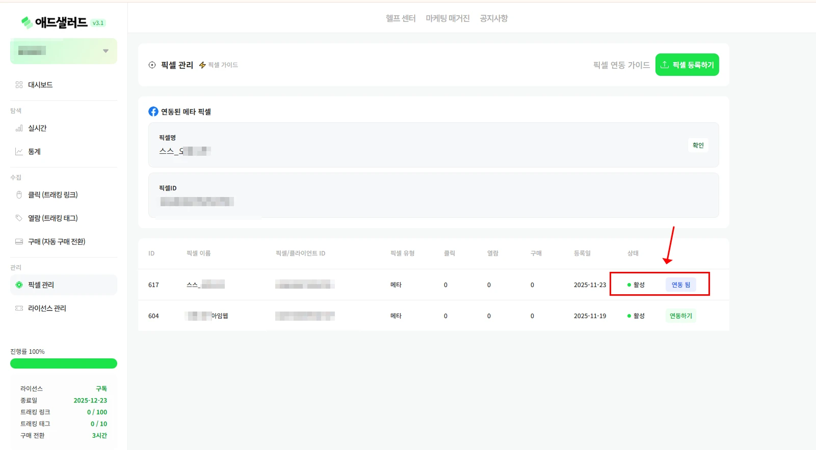 스마트스토어와 아임웹을 둘 다 픽셀을 세팅했는데, 상태에서 활성에서