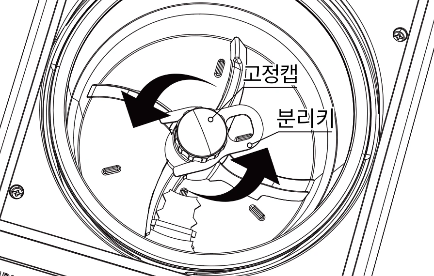 블레이드 중앙에 있는 고정캡의 아래 쪽에 분리키를 끼우고, 고정캡을 반시계 방향으로 돌려서 풀어주세요.