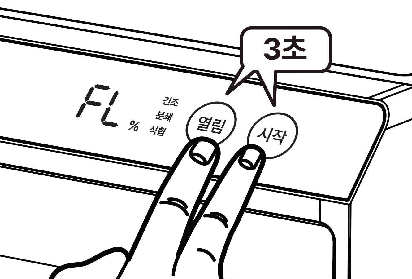 필터 교체가 완료 되면 '열림+시작' 버튼을 3초간 눌러 필터 사용시간을 초기화 해주세요.