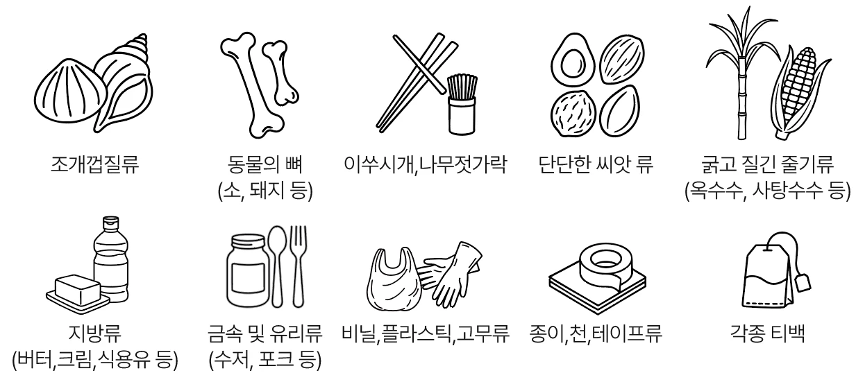 사람이 먹고 소화시킬 수 없는 물질, 딱딱하고 분해가 안되는 물질은 투입이 불가능합니다.