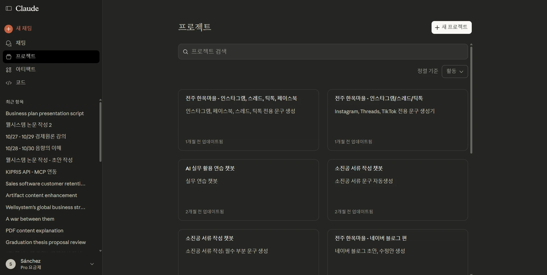 들어가며: "또 같은 설명을 반복하고 있다면?" Claude와 대화하다 보면 이런 경험 없으신가요? "아, 맞다. 내가 어떤 프로젝트 하고 있는지 설명 안 했지..." "저번에도 설명했는데, 새 채팅방이라 또 처음부터 설명해야 하네..." 취업 준비생이든, 이미 실무를 하고 계신 분이든, AI를 업무에 활용하면서 가장 답답한 순간이 바로 맥락을 반복해서 설명해야 할 때입니다. 이 문제를 해결하는 게 바로 Claude Projects 기능입니다. Claude 프로젝트가 뭔가요? 간단히 말하면, "내 프로젝트 전용 AI 비서"를 만드는 기능입니다. 일반 채팅방은 대화가 끝나면 맥락이 사라지지만, Project에서는 하단 내용의 다른 기능을 제공합니다. 이 기능은 Pro 이상의 유료 요금제에서만 사용이 가능합니다. 프로젝트 관련 지식과 문서를 계속 기억합니다 커스텀 지시사항으로 Claude의 행동을 조정할 수 있습니다 여러 채팅방을 만들어도 같은 맥락을 공유합니다 팀원들과 협업할 수 있습니다 (Pro/Team 플랜) Claude 프로젝트를 어떻게 만들 수 있나요? ChatGPT에서 GPTs 만드는 방법하고 같습니다. Pro 요금제로 구독을 시작하신 후, 하단 이미지 내 왼쪽 상단에 있는 '프로젝트'를 클릭하세요. 그 다음으로 오른쪽 상단의 '+새 프로젝트' 버튼을 클릭하셔서 GPTs 만드는 방법처럼 진행하시면 됩니다.