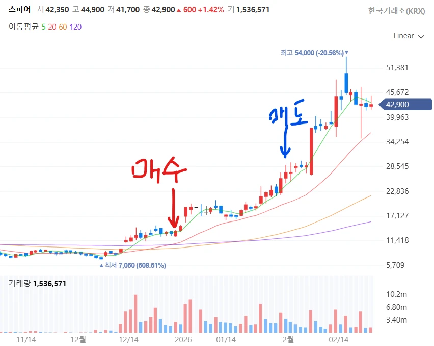 1/30 당시 시장 요약에서도 민간 우주가 확산 구간에 있었고, 실제로 매도 후 2/6에 37,350원, 2/13에는 44,600원, 2/20에는 54,000원(고점)까지 이어졌다(매도가 대비 +57.7%).