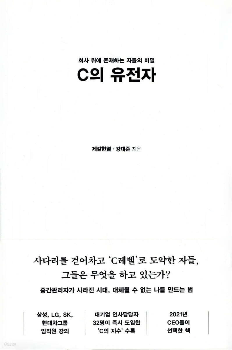 삼성, LG, SK, 현대차그룹 임직원 강의대기업 인사담당자 32명이 즉시 도입한 ‘C의 지수’ 수록2021년 CEO들이 선택한 책“사다리를 걷어차고 ‘C레벨’로 도약한 자들, 그들은 무엇을 하고 있는가?”중간관리자가 사라진 시대, 대체되지 않는 나를 만드는 ...