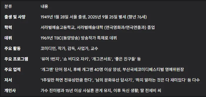 2025년 9월 25일, 한국 코미디의 한 시대를 풍미하고 그 근간을 다졌던 원로 코미디언 전유성 씨가 향년 76세의 나이로 별세했다는 소식이 전해졌다. 대한민국방송코미디언협회에 따르면, 고인은 폐기흉 증세가 악화되어 입원 중이던 전북대학교 병원에서 영면에 들었다.1 그의 부고는 단순한 한 개인의 사망 소식을 넘어, 한국 대중문화에 독보적인 발자취를 남긴 한 거장이 우리 곁을 떠났음을 의미했다. 평생을 '지구에 처음 온 사람처럼' 살며 기존의 틀을 깨고 새로운 아이디어를 끊임없이 창조했던 그의 삶은 한국 코미디의 역사 그 자체였다. 이 보고서는 그가 남긴 웃음과 예술, 그리고 후배들에게 심어준 가르침의 발자취를 추적하며, 그가 한국 코미디계에 남긴 영원한 유산을 깊이 있게 조명하고자 한다.