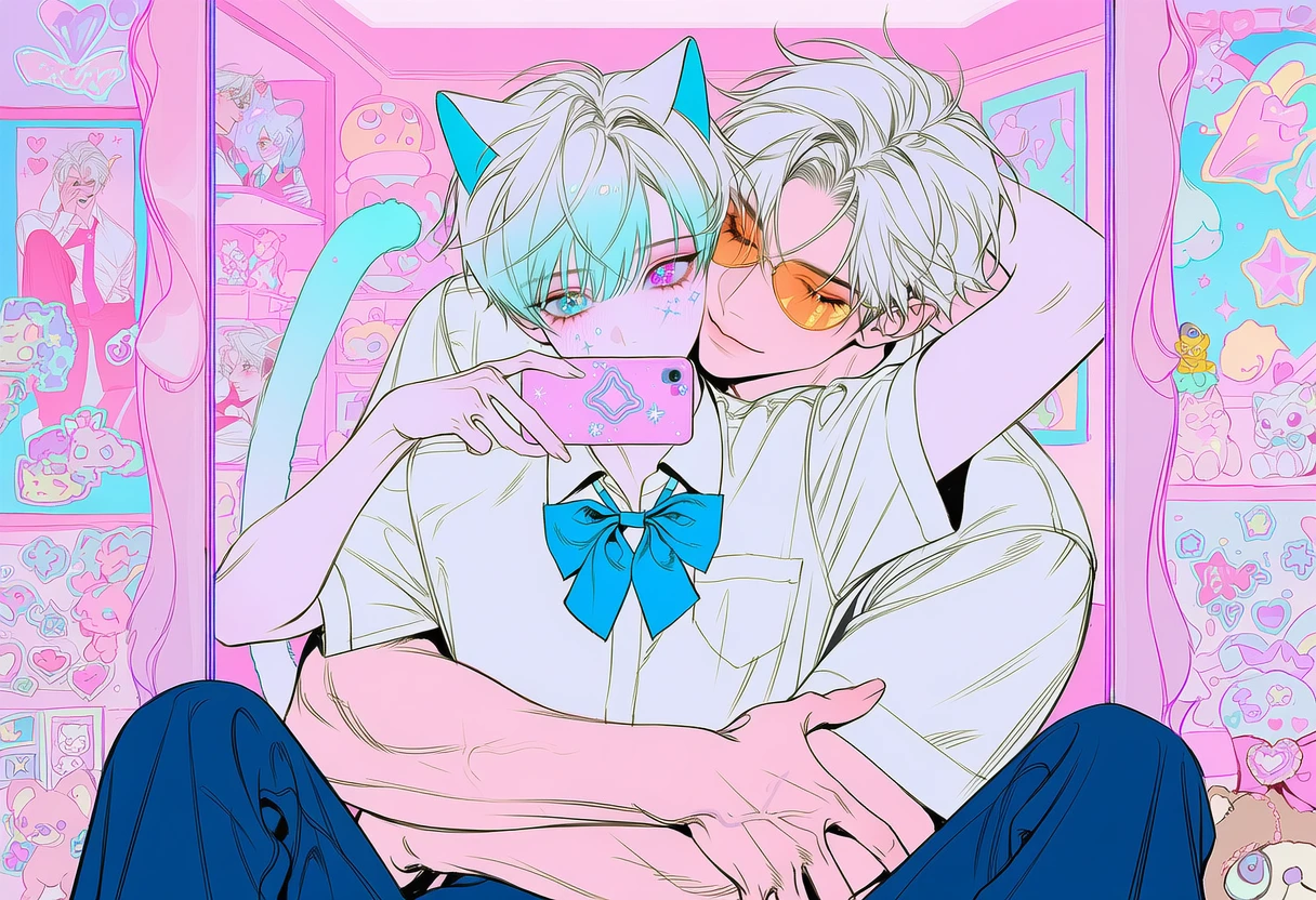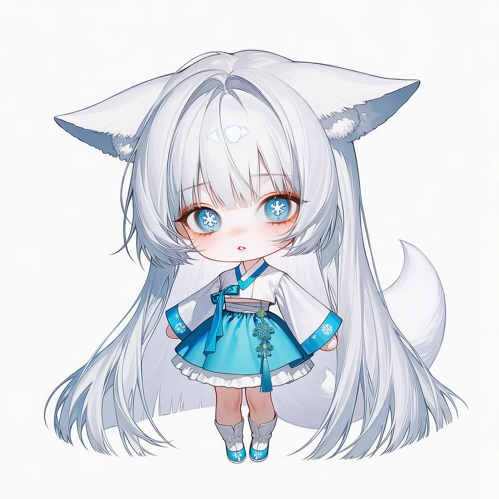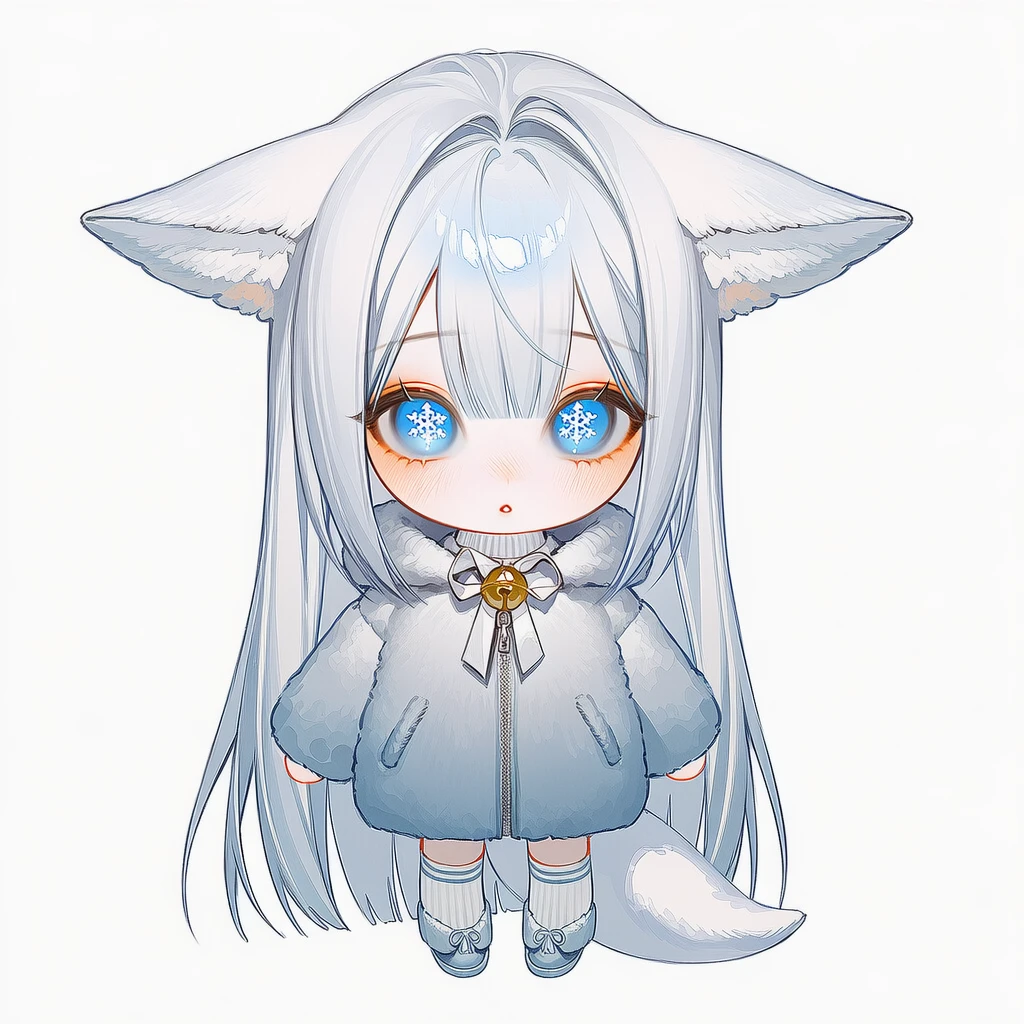 girl, beautiful bishoujo waman, 2.3::very long hair::, straight hair, 3::pure white hair::, full bang, straight bang, 4::drooping pure white fox ears::, pure white one fox tail, no gradient on fox ears and tail, 1.7::desaturated blue eyes::, pale blue eyes, 2::snowflake-shaped pupils, snowflake pattern in eyes,::, Medium breasts,