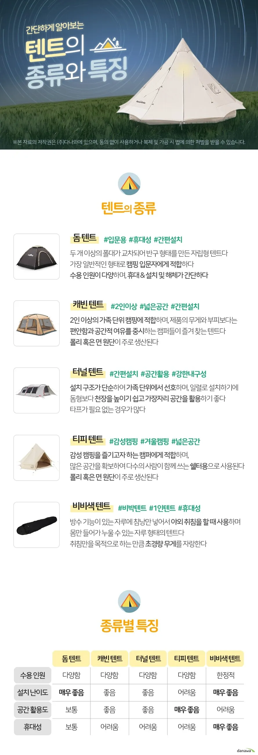 텐트 스펙 까막눈 탈출을 위한 첫 걸음! Q. 세상에 완벽한 텐트가 있을까요? 🧐 제 생각은 ··· 🙅♀️❗ 사실 세상 모든 것에 One for All 은 있을 수 없다고 생각해요. 텐트 역시 재질, 직조 방식, 코팅 등 여러가지 요인들에 의해 그 특징이 달라지는데요. 수~~~~ 많은 텐트 중 우리는, 각자의 선호나 사용 계절, 사용 조건 등에 따라 적절한 제품을 찾고 즐길 수 있으면 좋겠습니다. 이번 1탄 에서는 우리에게 가장 중요하게 고려하는 텐트의 내구성과 무게! 의 결정적인 기준인 데니어와 스레드에 대해 이야기 하려고 합니다! [목차] 데니어와 쓰레드 텐트 구성 별 특징 스타일 별 고려사항 1. 데니어(D)와 쓰레드(T) 원사 단위 POINT ! 실 하나가 얼마나 굵을까 ? = D 실이 얼마나 많이 들어갔을까? = T (1) 데니어 Denier는 원사나 섬유의 굵기에 대한 단위입니다. 보통 숫자 뒤에 D를 붙여 표기합니다. 즉, D가 높을 수록 실이 굵은 것입니다.