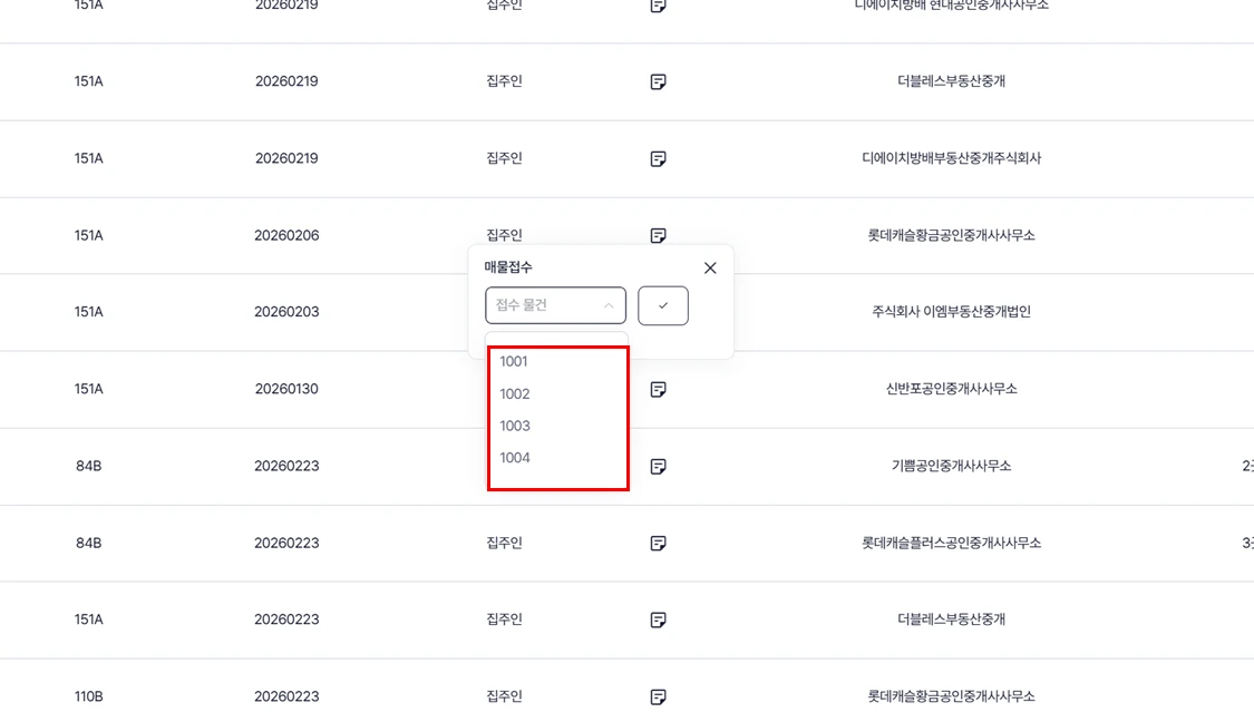 매물 접수를 누르면 표시광고 규정에 따라 예측되는 매물 정보를 보여줍니다. 해당 물건을 편리하게 선택하세요.