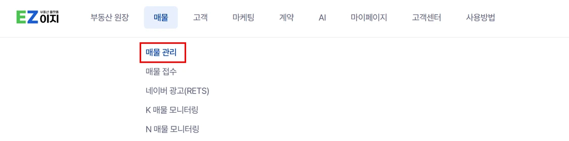 매물 > 매물관리에서 접수된 매물 목록을 확인할 수 있습니다.