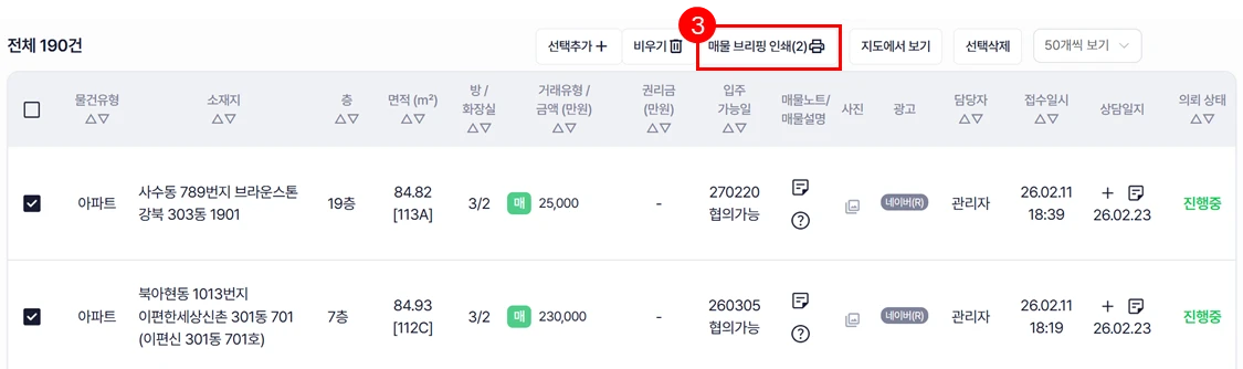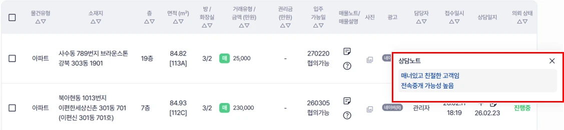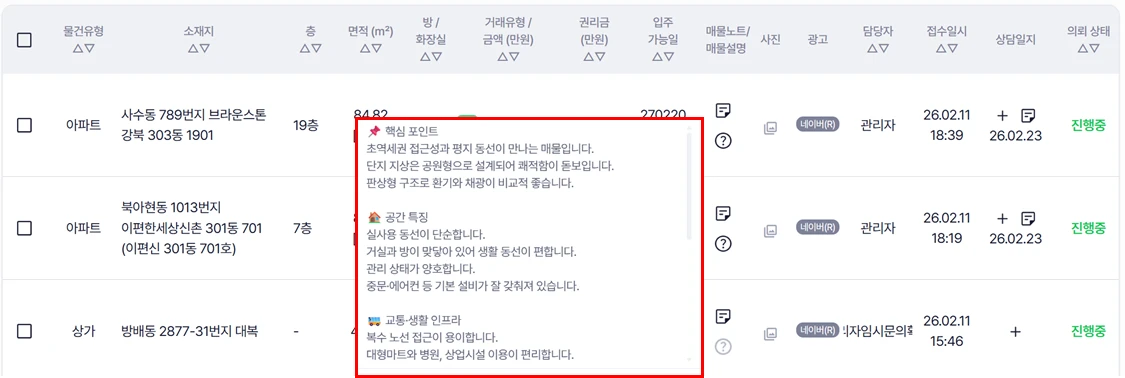 매물 접수를 했다면 접수한 매물을 한 눈에 확인하고 고객들에게 브리핑까지 한번에 할 수 있어야 합니다. 또한 나만 보는 것이 아니라 고객과 함께 보는 상황도 필요합니다. 이때 보여주고 싶은 정보와 나만 보고 싶은 정보가 구분되어 있어 편리합니다.