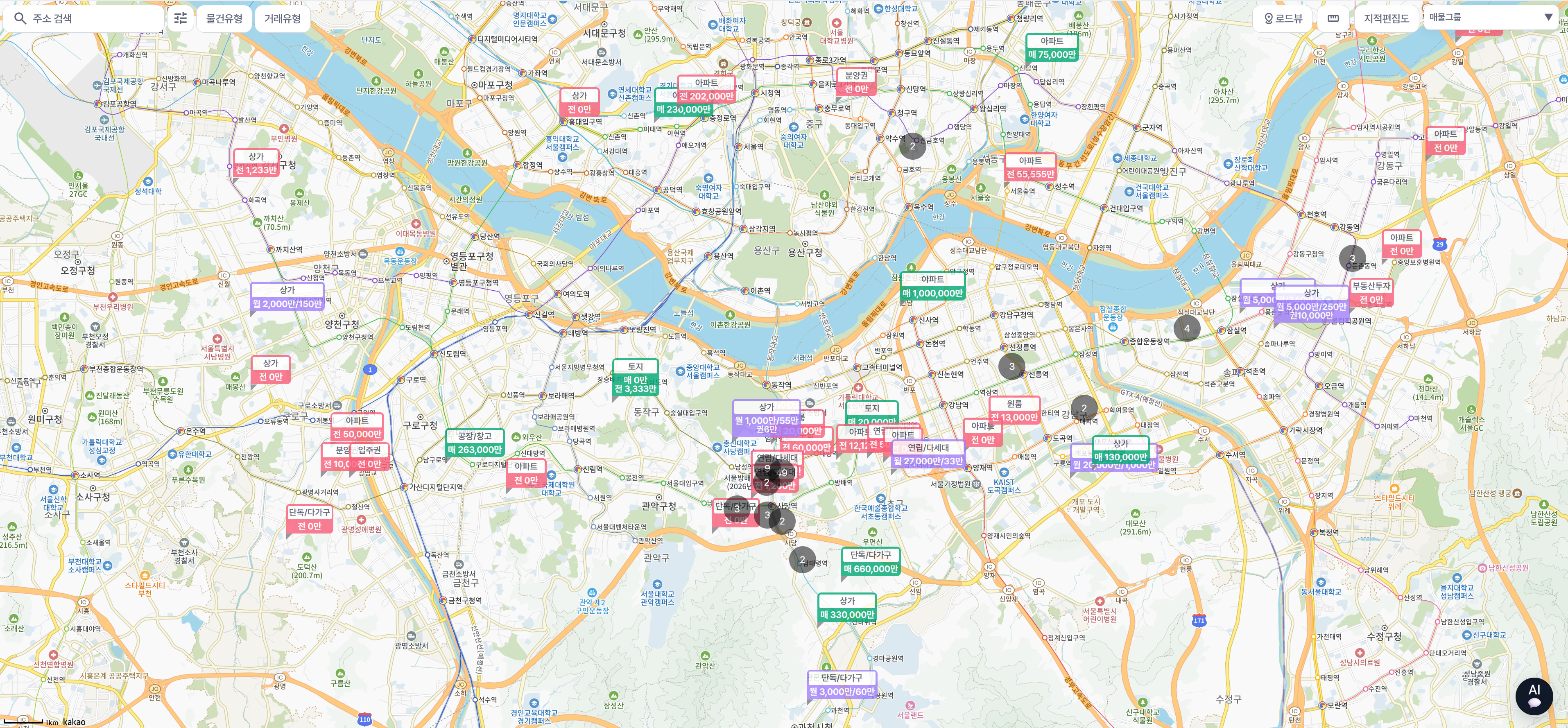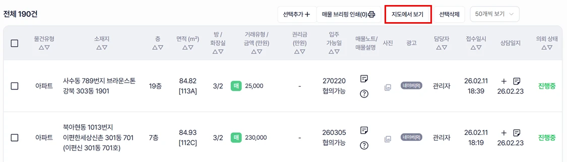 지도에서 보기 버튼을 클릭하면 지도위에 매물이 표시됩니다.