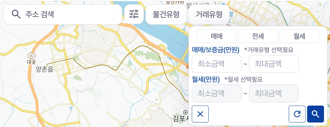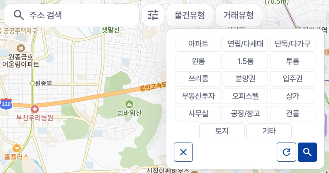 물건유형 및 거래유형에 따라 매물을 선택적으로 볼 수 있습니다.