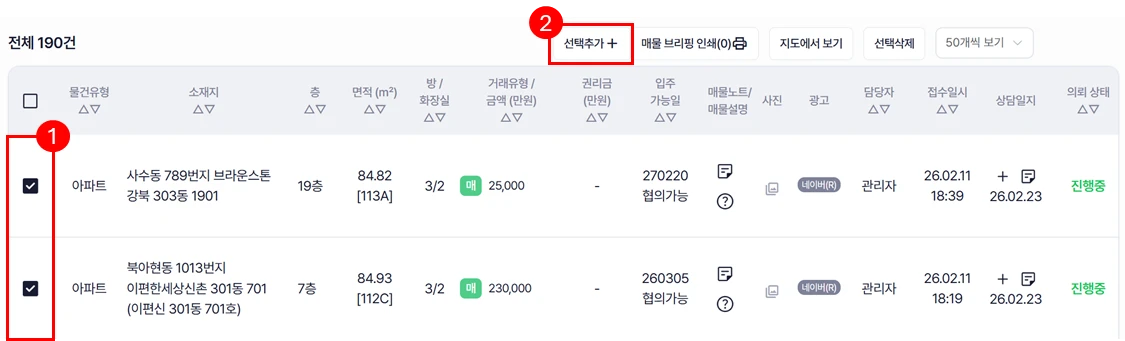 매물 목록에서 요약표를 만들고 싶은 매물을 선택하여 '선택추가+'를 클릭합니다.