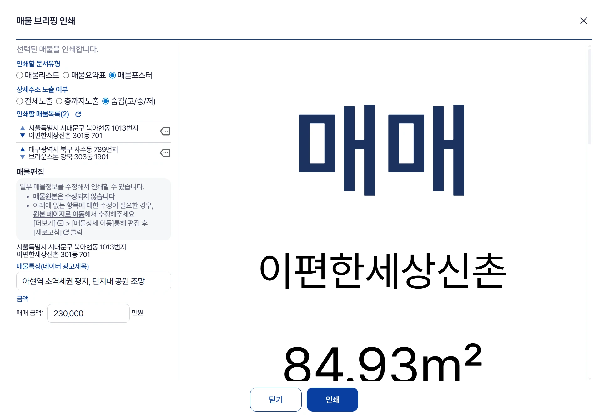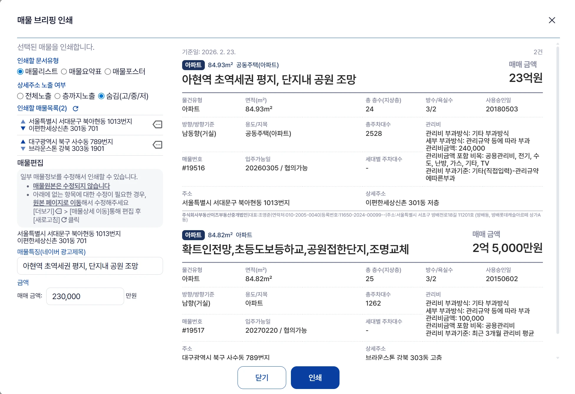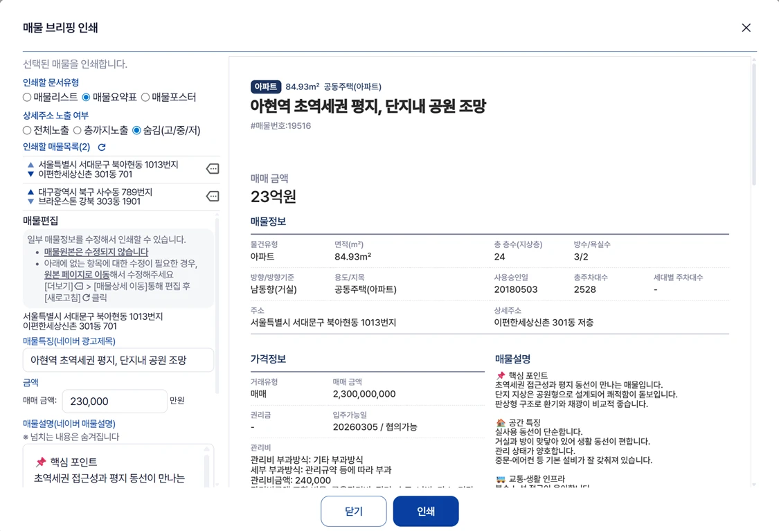 ✅ 3. 매물 브리핑 인쇄 (매물리스트 / 매물요약표 / 매물포스터)