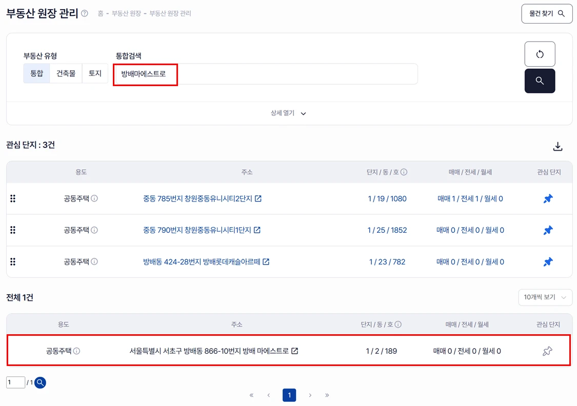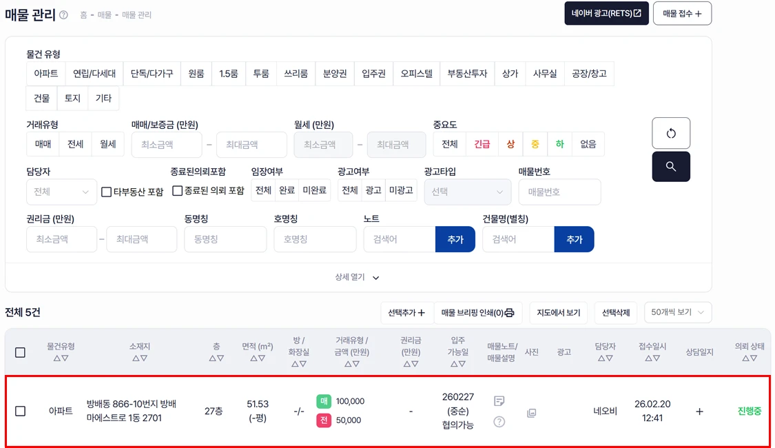 매물 접수 리스트에서 매물이 정상적으로 접수된 것을 확인할 수 있습니다.