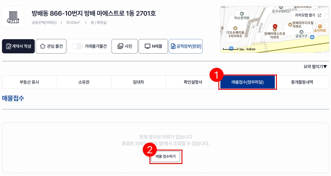 매물접수(첨부파일) : 부동산에 대한 기본정보를 확인하셨다면 '매물 접수하기' 버튼을 클릭해서 매물을 바로 접수할 수 있습니다.