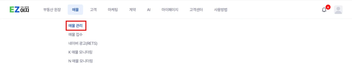 매물 > 매물관리에서 접수된 매물을 확인할 수 있습니다.