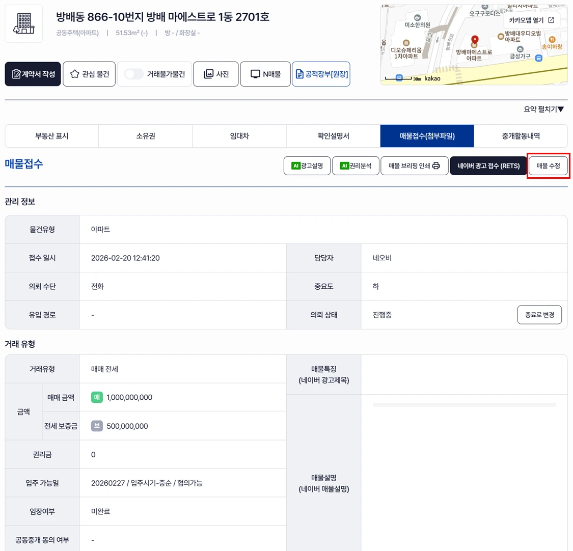 매물 접수가 잘못되었다면 수정버튼을 눌러 어렵지 않게 수정할 수 있습니다.
