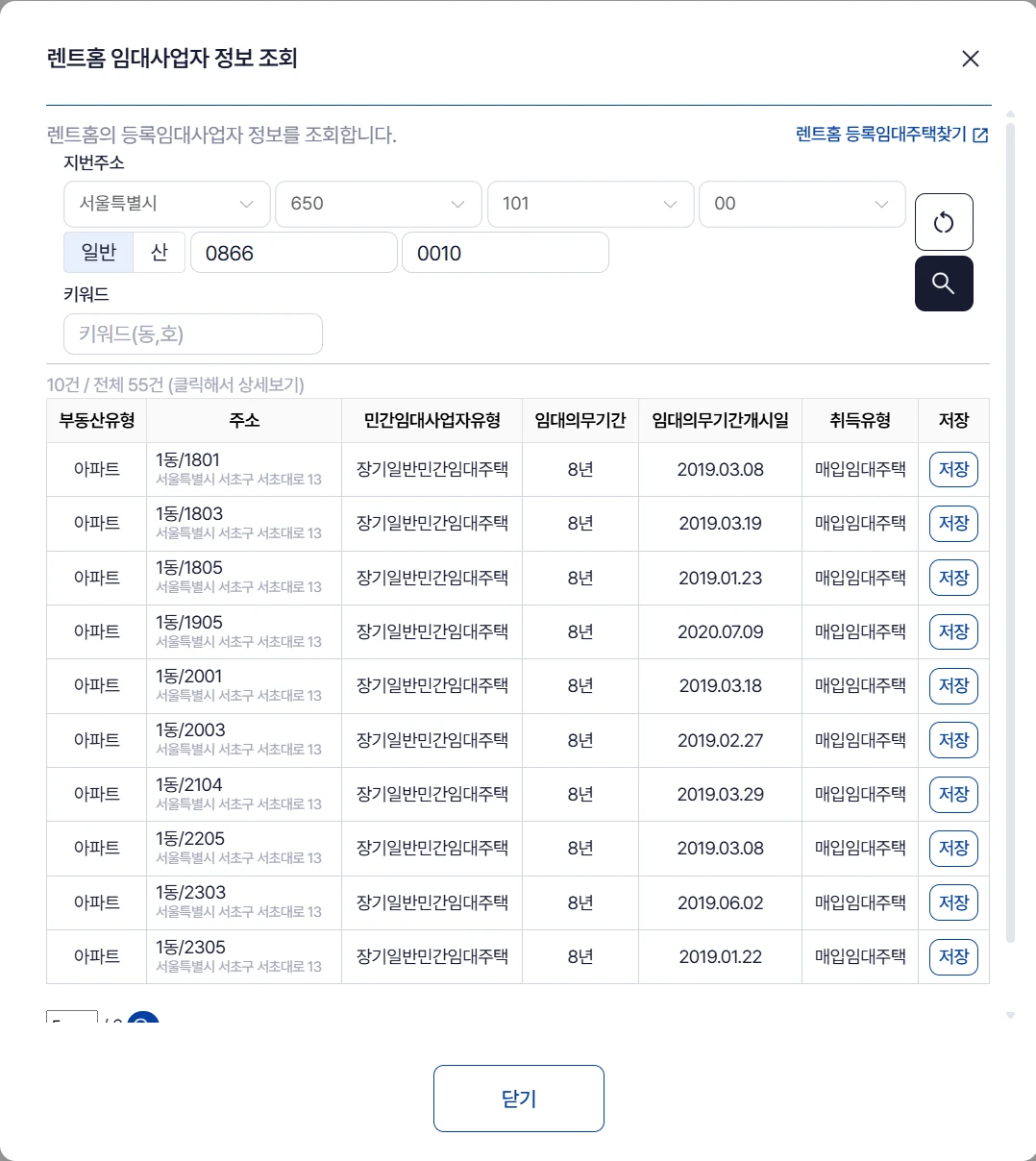 2) 랜트홈 조회 버튼을 클릭하여 주택임대사업자 호수정보를 확인하고, 부동산이지로 바로 '저장'해서 가지고 오세요.