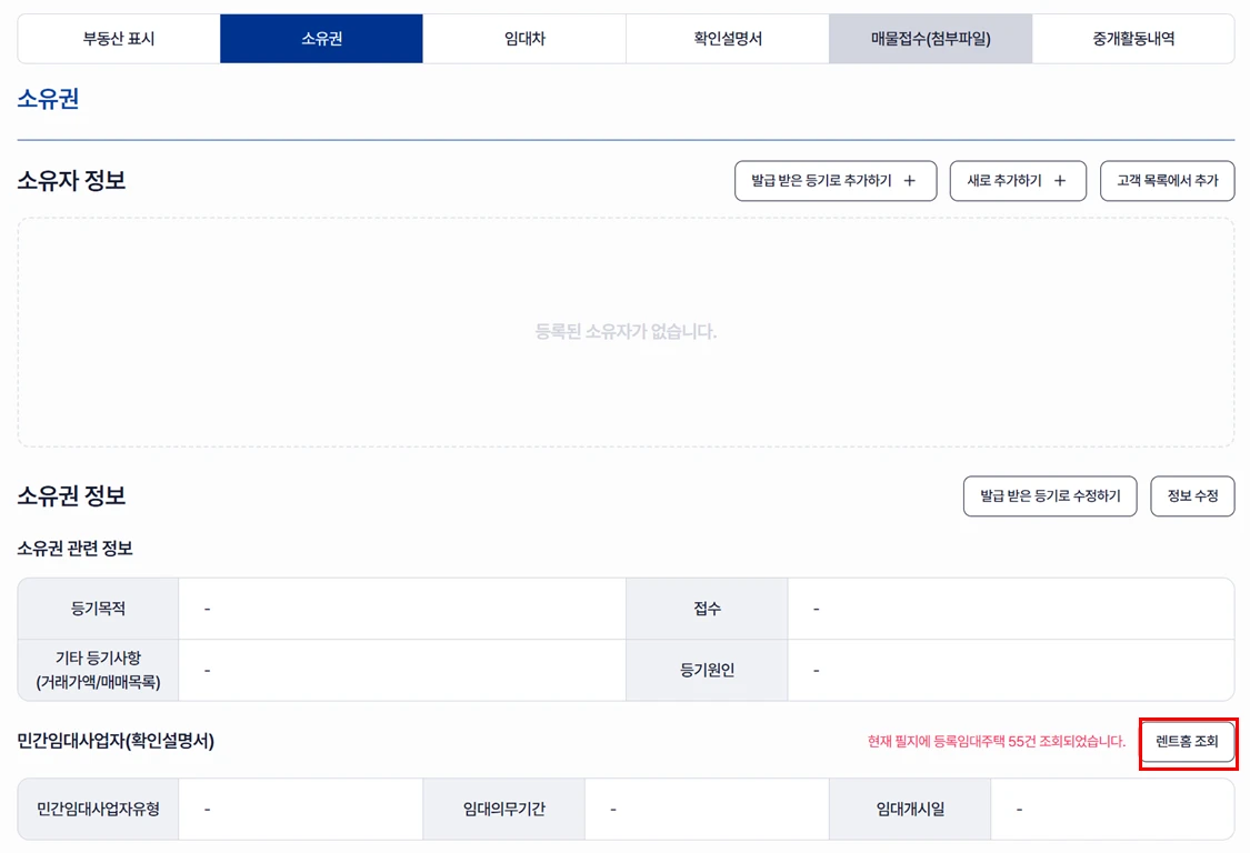 상세 정보 입력 : (선택) 부동산, 고객, 소유권, 임대차 정보
