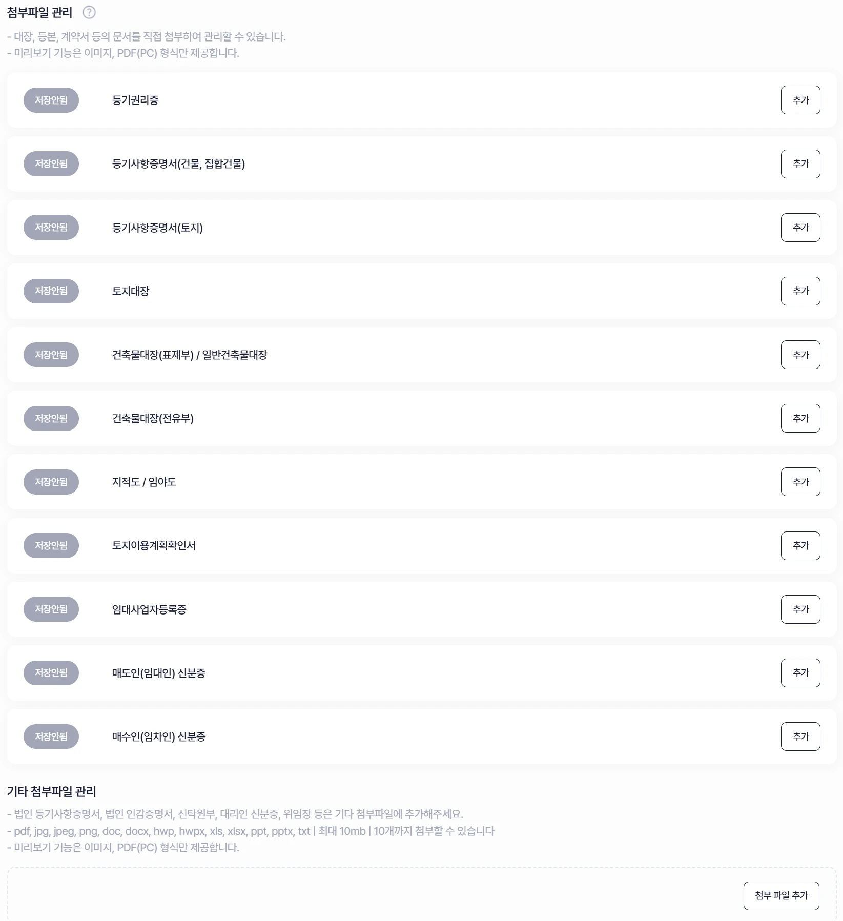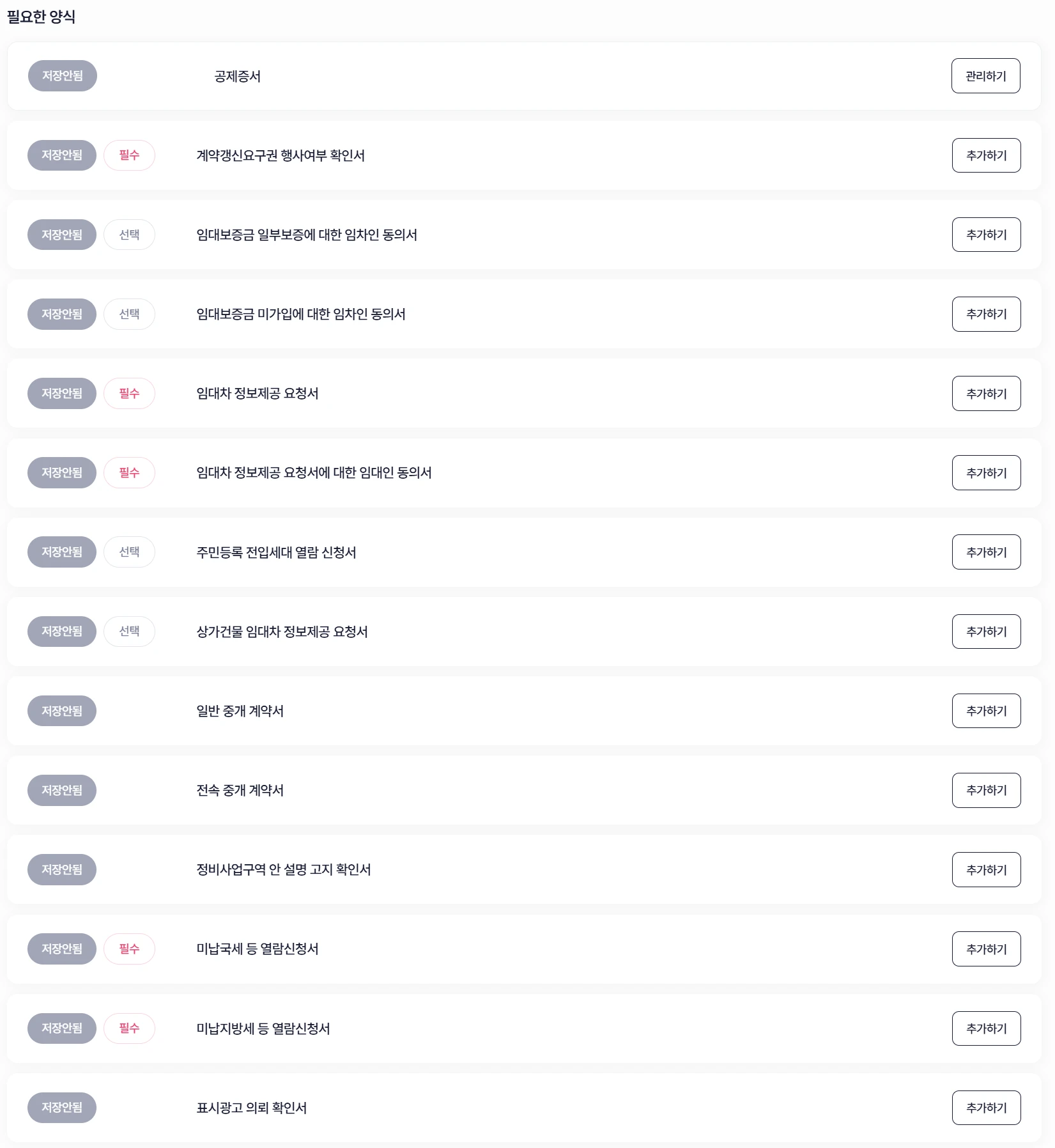 추가 서류 관리 : (선택) 부동산 거래에 필요한 서류