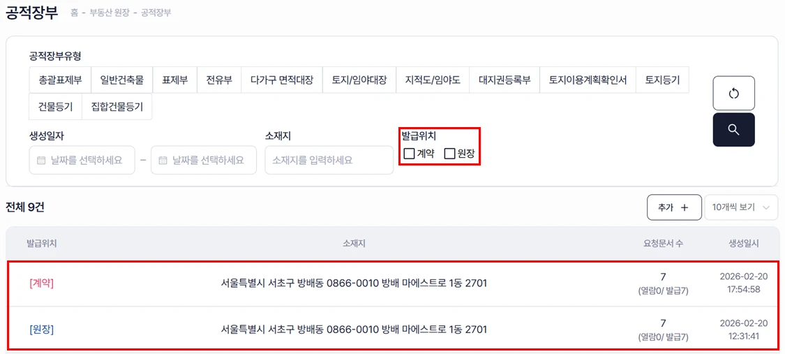 생성일자 : 특정 기간의 공적장부 확인만 필요한 경우 (특정주소의 생성일자별 공부를 확인할 수 있음)