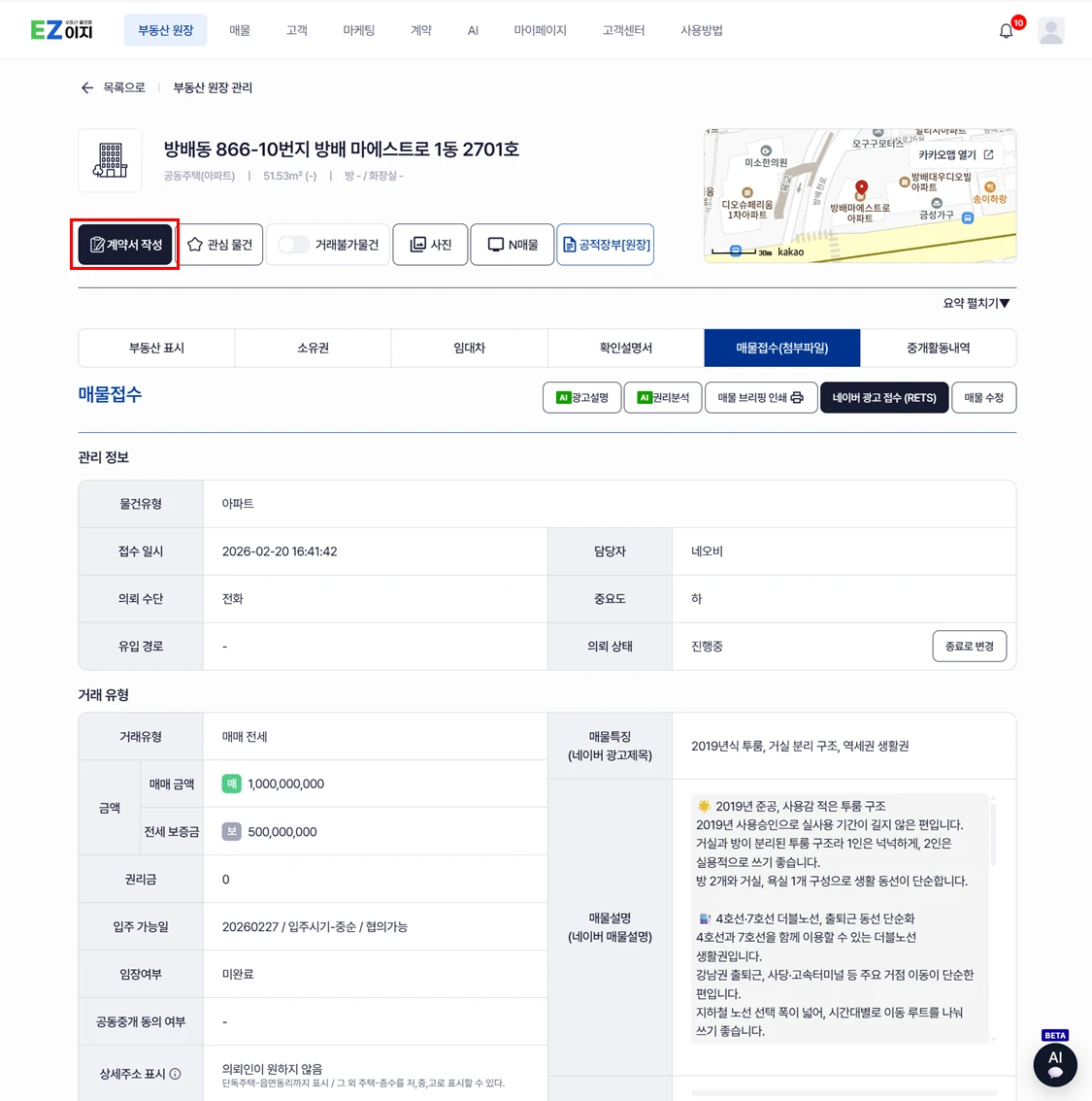 "기 접수된 매물에서 계약서를 작성하면 더욱 편리합니다" (매물 > 매물관리)