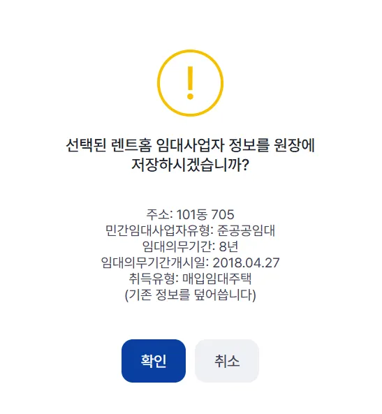 다만, 해당 호실에 임대사업자 정보를 직접 넣어드리려고 하였으나 그렇게 하는 경우 오히려 오류가 많이 발생하여 랜트홈 조회 후 나타나는 화면에서 직접 '