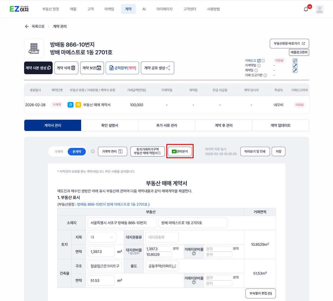 [Tip] 계약서 작성시 권리분석은 계약서의 내용을 입력하는 경우 계약서 내용이 포함된 권리분석이 진행됩니다.