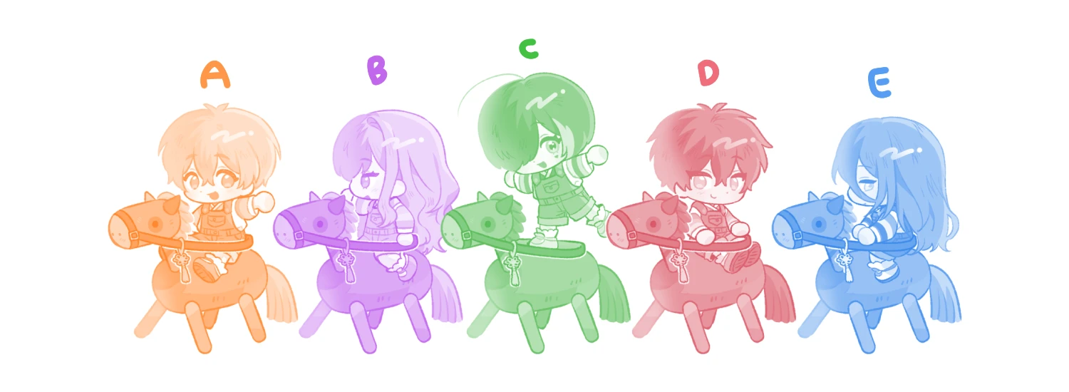 각 캐릭터의 포즈 및 자리: A,B,C,D,E 의 자세 중에 선택 가능합니다. 왼쪽부터 1번자리입니다. ex) A캐: 1번자리/A포즈 B캐: 3번자리/D포즈