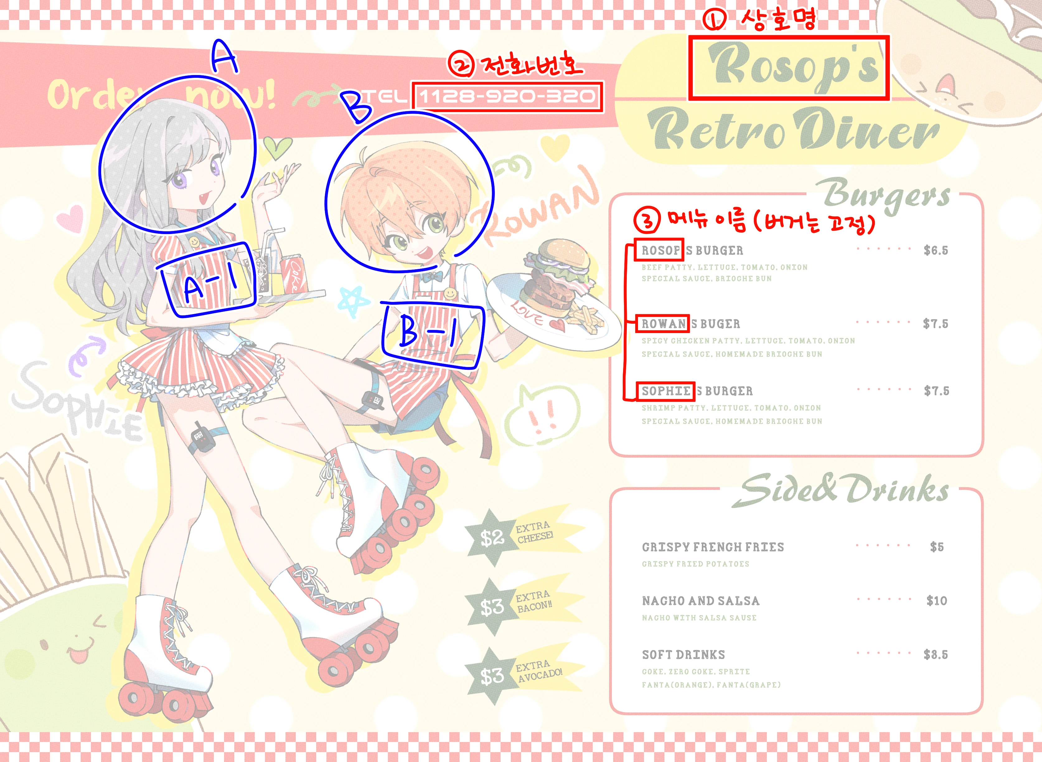상호명, 2) 전화번호, 3) 메뉴 이름 (3가지 순서대로)