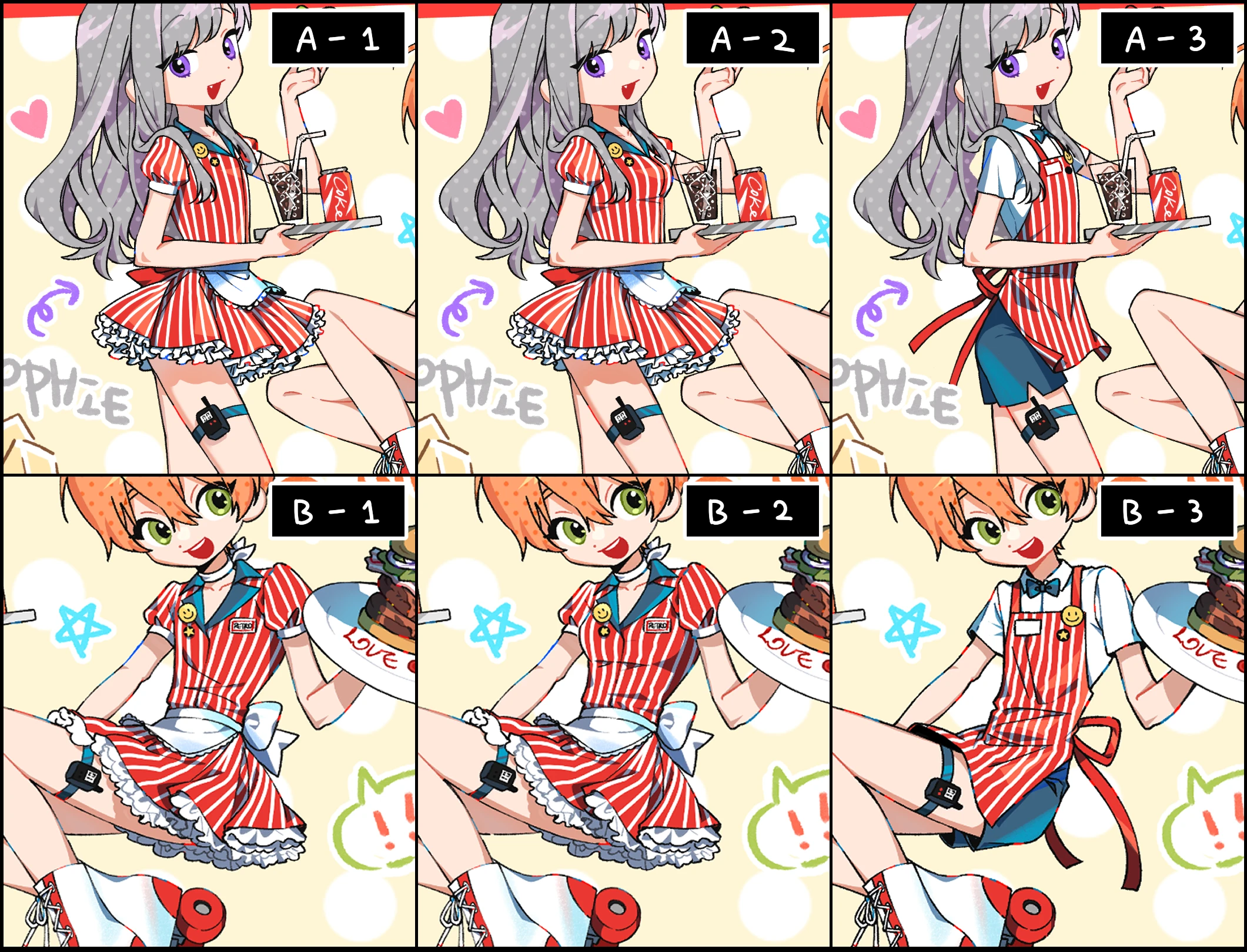 (의상 디자인 선택/색상 선택) /ex)왼쪽 캐릭터 A-1(색상변경X), 오른쪽 캐릭터 B-3(색상 변경: 남색) 등등…