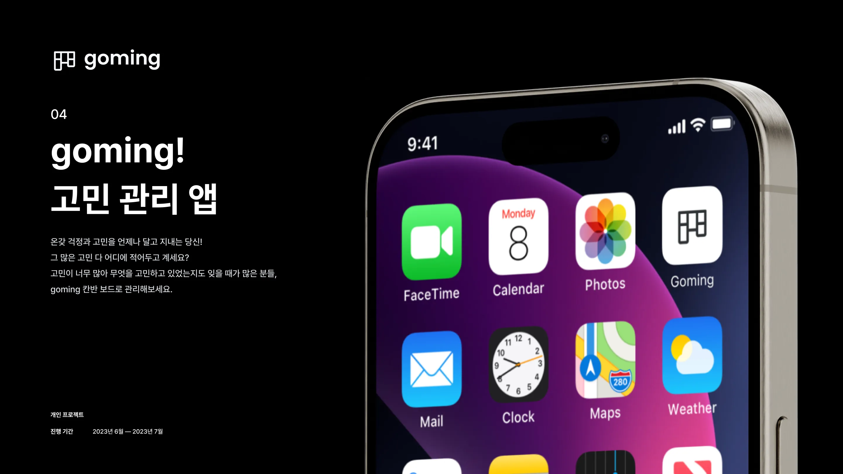 goming goming은 칸반 보드 형식의 생각 관리 앱입니다. 저만의 자잘한 고민들을 한꺼번에 관리하는 방식을 칸반 보드 스타일의 앱으로 풀어낸 컨셉 프로젝트입니다. 프로젝트 개요 개인 프로젝트 프로젝트 기간: 2023년 6월 저는 제가 운영하는 1인 비공개 카페에서 고민을 털어둡니다. 카페 게시판 중 고민을 임시 저장해두는 저장소 [고민들 일단 임시 저장] 게시판이 있고, 그 중 해결된 고민이 생기면 그런 고민들을 옮기는 저장소 [해결한 고민들이 오는 곳] 게시판이 있습니다. 카페 게시글로 관리해도 괜찮지만, 가끔 휴대폰에서 빠르게 관리하고 싶다는 생각이 들어 '메모' 앱을 사용해봤지만 텍스트를 일일이 적고 지우고 복사하고 붙여넣는 과정이 번거로웠습니다. '노션' 앱은 제 고민들을 관리하기에는 기능이 너무 많고 무거웠습니다. 다른 노트테이킹 앱들도 마찬가지였습니다. 카페 게시글로 관리할 때 불편했던 점과 니즈를 추려봤습니다. 해결되지 않은 고민과 이미 해결된 고민을 한눈에 보고 싶다 해결되었다고 생각한 고민을 다시 고민하게 될 때가 있음