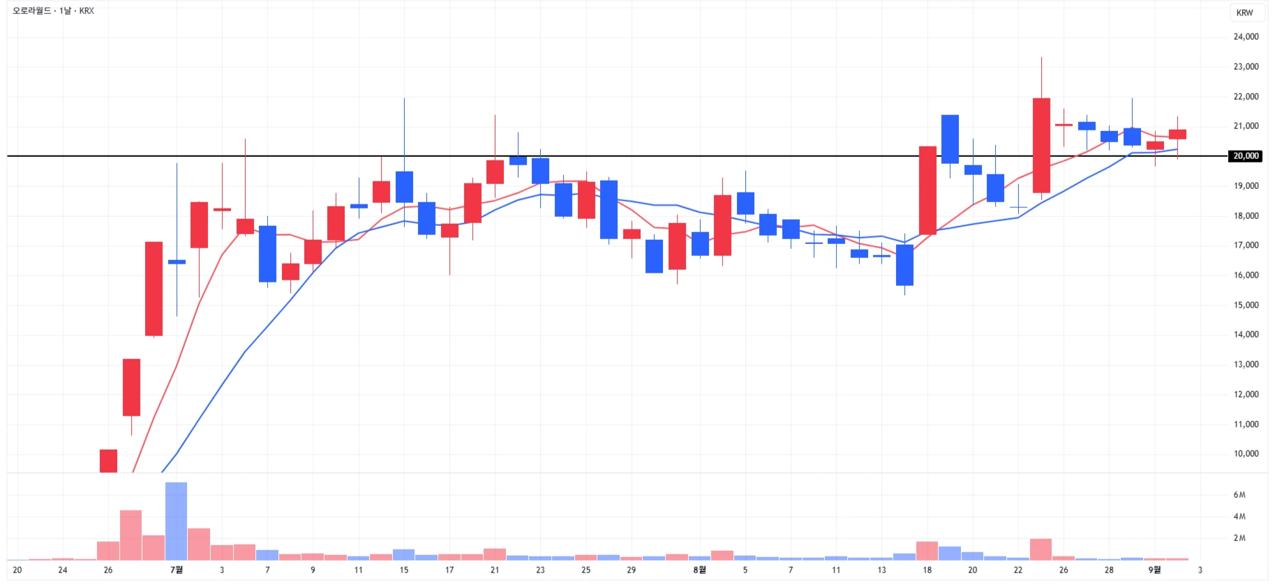 4) 오로라 : 이전 저항 구간이었던 2만원에서, 소폭 반등 성공
