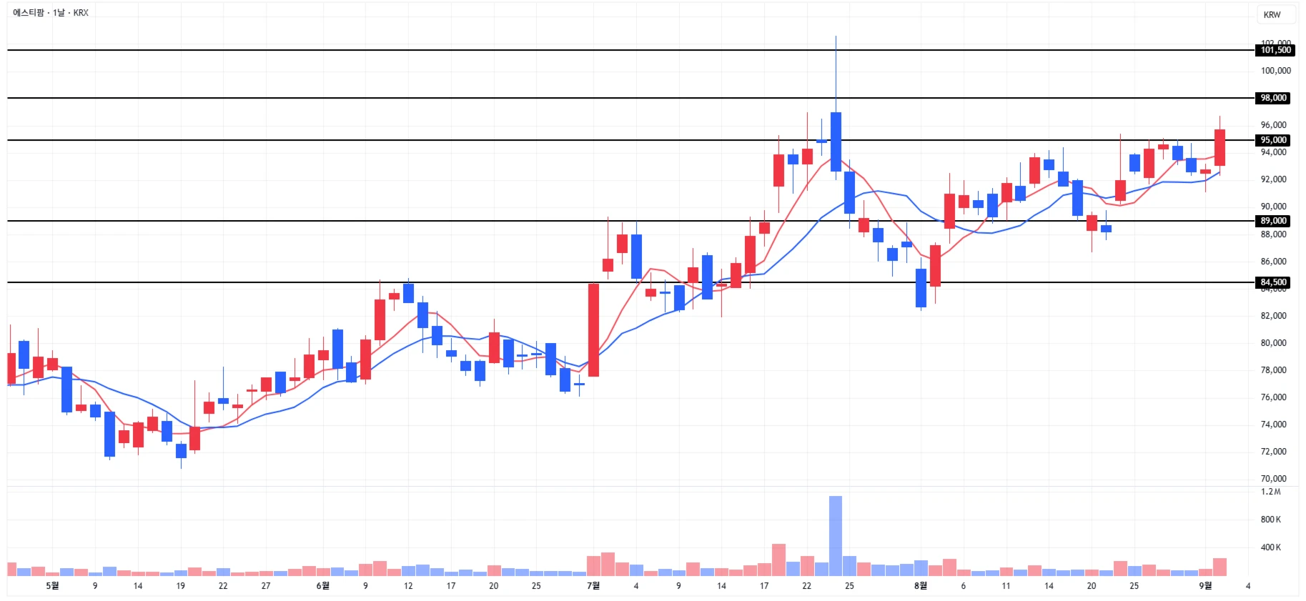 2) 에스티팜 : 당일 직전 고점 구간 돌파 하는 좋은 모습으로 마무리
