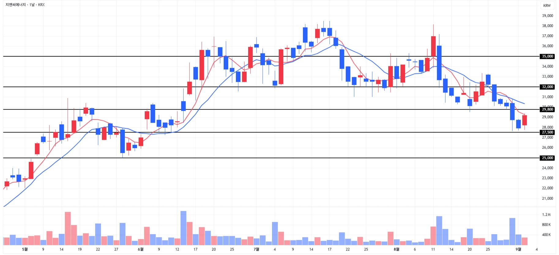 1) 지엔씨에너지 : 연속적인 하락세를 벗어나, 당일 지지 구간에서 반등 성공