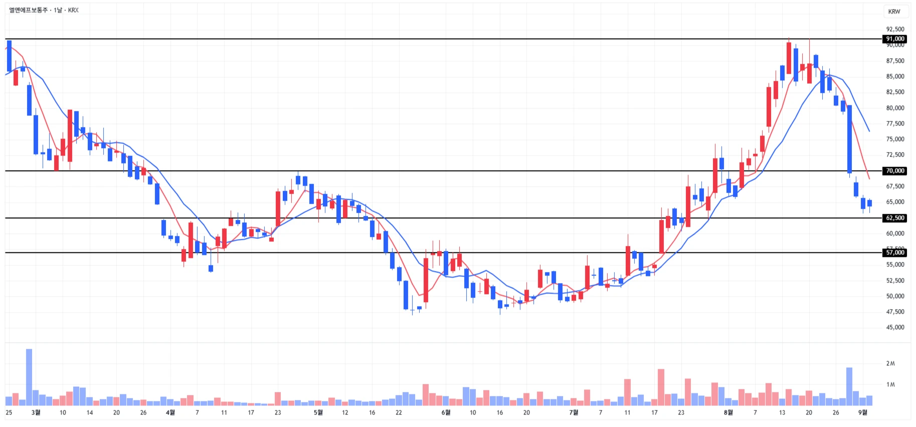 1) 엘앤에프(양극재) : 당일 큰 변동성 없이 1차 지지 구간 근처에서 마무리