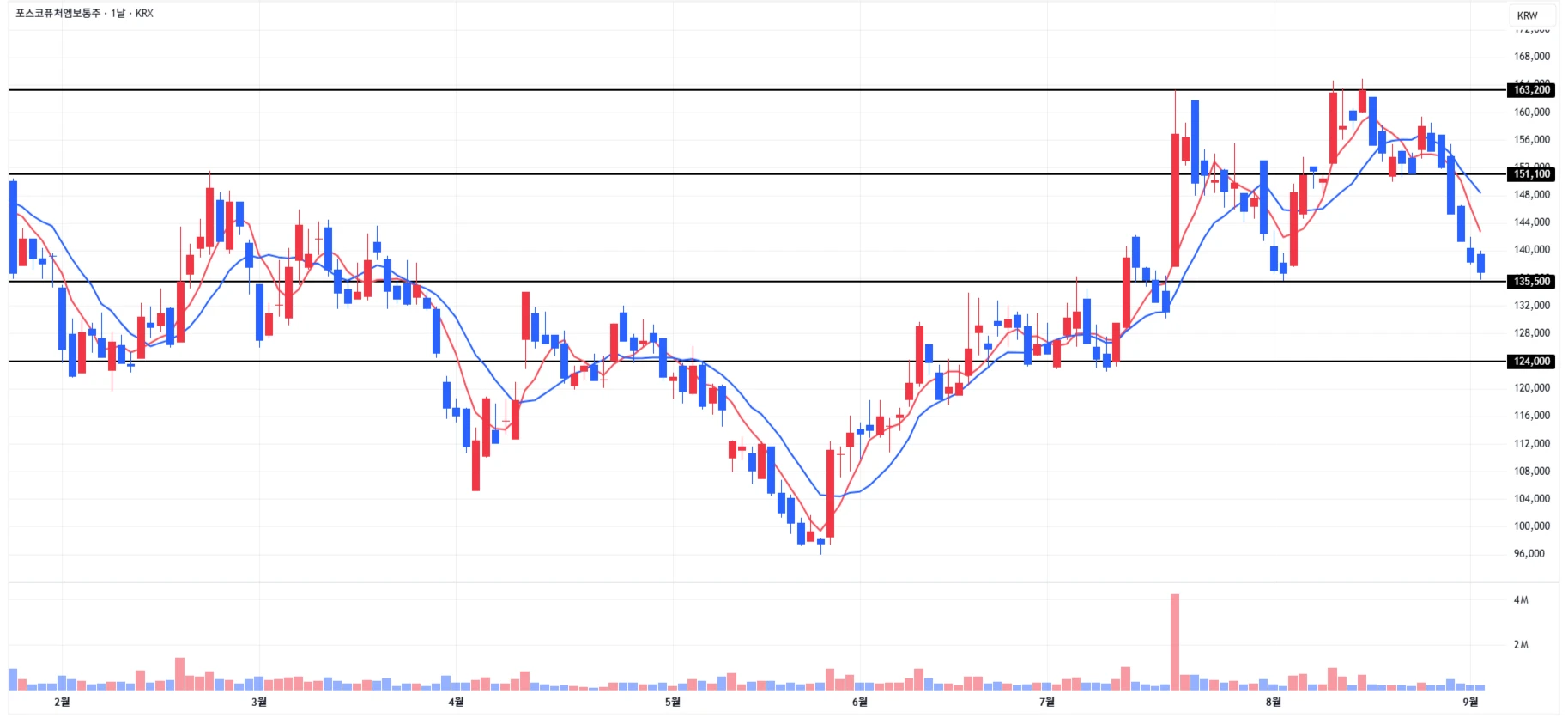 2) 포스코퓨처엠(양극재, 음극재) : 당일 소폭 하락하였지만 1차 지지 구간 근처에서 마무리