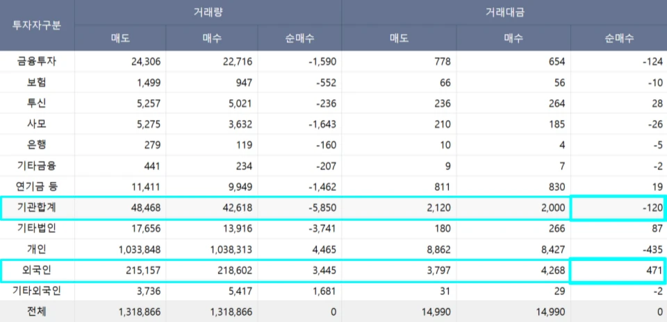 금일 기관은 총 1천억 매도하였으나, 외국인이 약 4,700억 정도를 매수하며 시장 반등을 주도